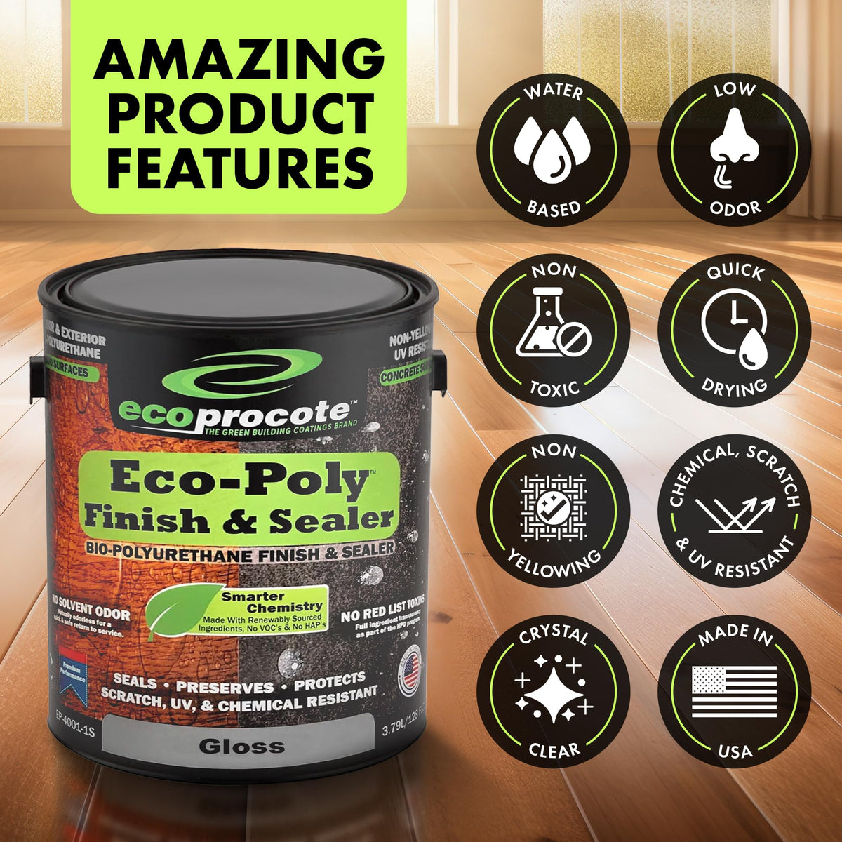 HIGH QUALITY SURFACE FINISH: Our polyurethane sealer for wood, floor, and concrete surfaces provides scratch, crack, moisture, UV and chemical resistance, ensuring a long-lasting sheen for your indoor and outdoor projects. WATER-BASED, LOW ODOR: Made with water-based polyurethane, this gloss finish sealer is virtually odorless and dries faster than oil-based counterparts. MULTI-LAYER PROTECTION: The Eco-Poly sealer is formulated to be highly durable. For best results and optimum sealing, apply a minimum of two coats on the surface for an elegant gloss finish. VERSATILE USES: Excellent for applying a protective wood finish to your furniture, cabinets, decks, and wood floors. It can also be used as a masonry, concrete driveway sealer, and concrete floor sealer. NON-TOXIC, SUSTAINABLE: The Eco-Poly wood and concrete polyurethane sealer is made with advanced plant-based urethane technology and bio-emulsion resins. It is free of toxic off gassing, VOCs and Red List Chemicals. polyurethane wood finish wood sealer wood finish wood floor sealer clear wood sealer wood clear coat home improvement polyurethane clear gloss clear coat concrete clear gloss home improvement paint supplies matte varnish clear polyurethane polyurethane varnish matte polyurethane water based varnish polyurethane satin polyurethane water based water based varnish polyurethane coating floor polyurethane polyurethane matte finish water based clear coat water based polyurethane