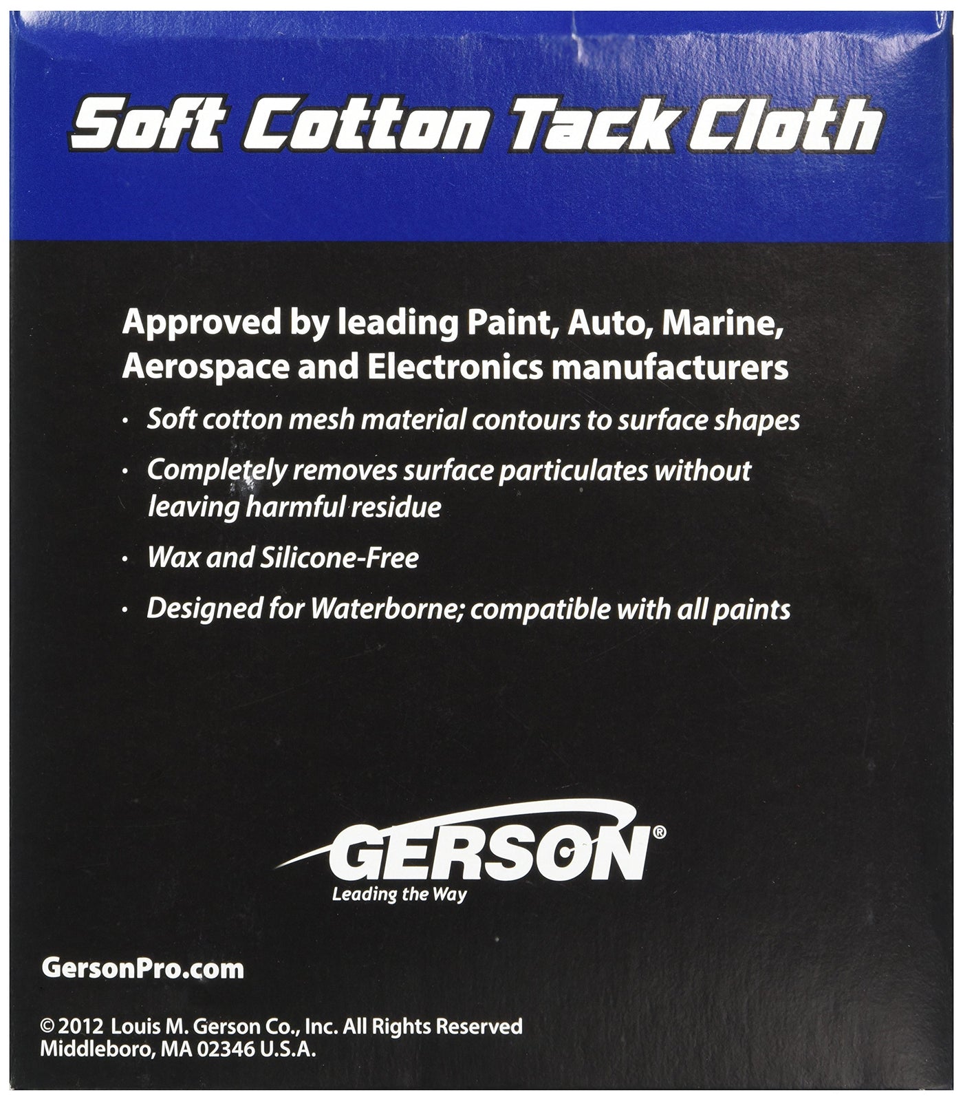 Q: What are the dimensions of each Gerson Tack Cloth?A: Each Gerson Tack Cloth measures a full 18 inches by 36 inches, providing ample surface area for effective cleaning and preparation before painting.