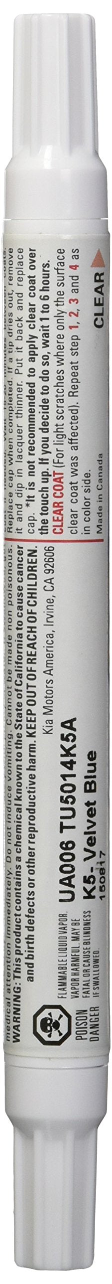 Q: What is the color match for the Kia UA006-TU5014K5A Touch-Up Paint Pen?A: The Kia UA006-TU5014K5A Touch-Up Paint Pen is specifically designed to match the Velvet Blue color of your Kia vehicle, ensuring a seamless repair for minor scratches and nicks.