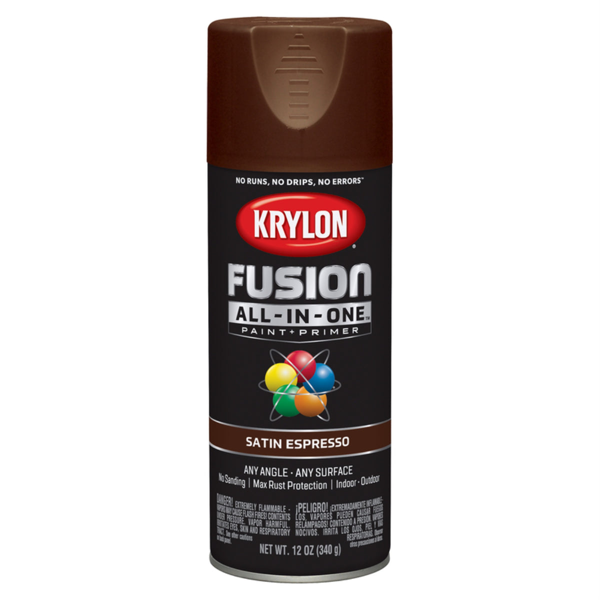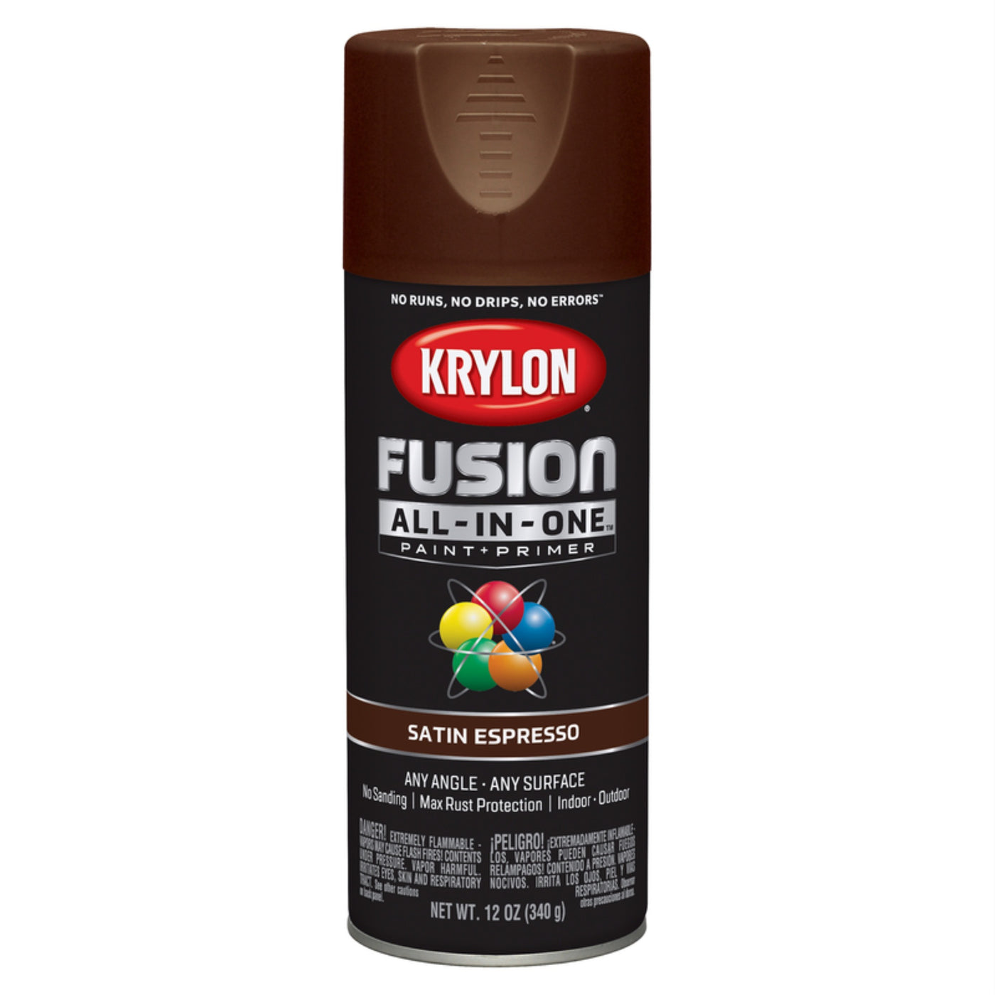 Krylon Fusion All-In-One is a premium product that bonds with 5X Stronger Adhesion to difficult surfaces such as plastics and ready-to-assemble furniture without sanding or priming. This product provides maximum rust protection for all outdoor projects and offers a broad color palette with multiple finishes and sheens for indoors and out.; ; Brand Name: Krylon Sub Brand: Fusion All-In-One Sheen: Satin Color: Espresso Product Type: Paint+Primer Spray Paint Container Size: 12 oz Coverage Area: 25 sq ft Inverted Spray Ability: Yes Primer Required: No Time Before Recoating: 48 hr Dry Time: 25 - 120 min UV Resistant: Yes Indoor or Outdoor: Indoor and Outdoor Clean Up: Solvent Skid Resistant: No Water Resistant: No Color Family: Brown Recommended Surface: Wood, Metal, Wicker, Plastic, Glass, Plaster/Ceramic, PVC, Hard Vinyl, Tile, Wrought Iron, Masonry and Laminate Mildew Resistant Finish: No