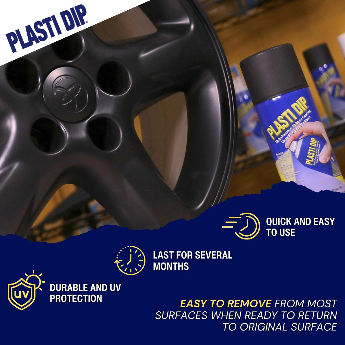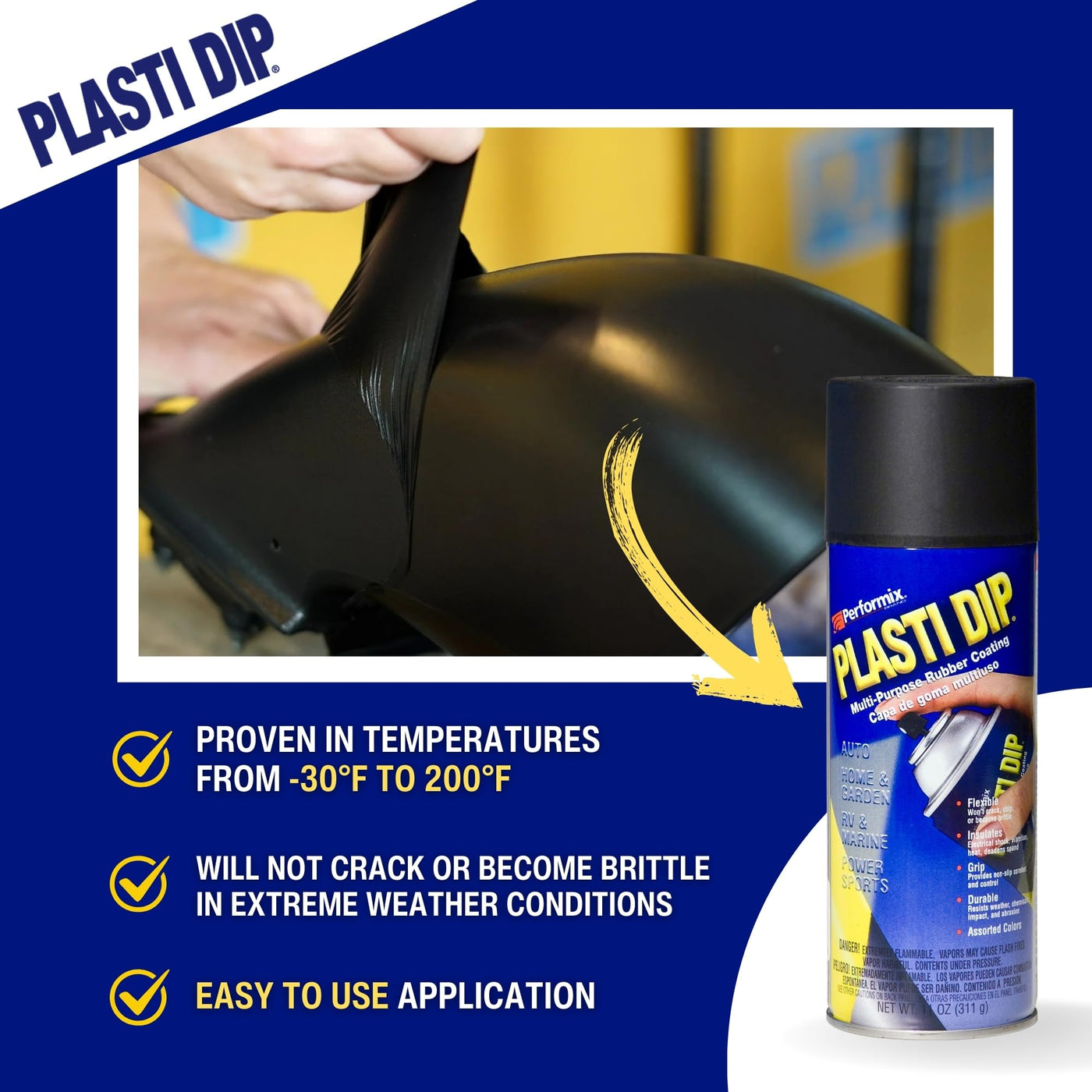 Q: Can I remove Plasti Dip once applied?A: Yes, Plasti Dip is peelable and can be easily removed from most surfaces when you're ready. This feature makes it ideal for temporary applications or customization.