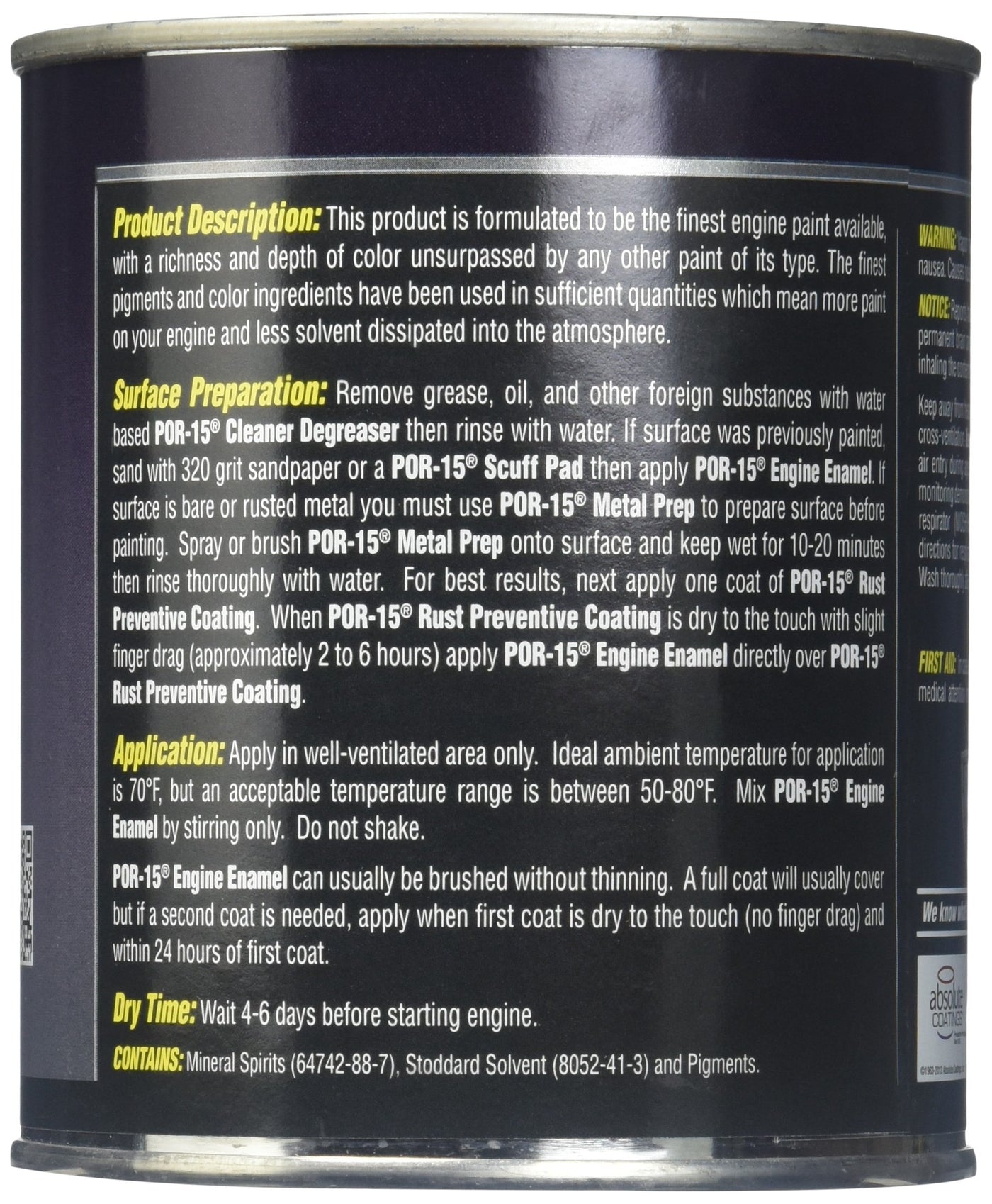 Q: Is POR-15 Engine Enamel safe to use?A: While POR-15 Engine Enamel is non-flammable and designed for high-temperature applications, it is classified as a hazardous material (paint). Proper safety precautions, such as using it in well-ventilated areas and wearing appropriate protective gear, are recommended during use.