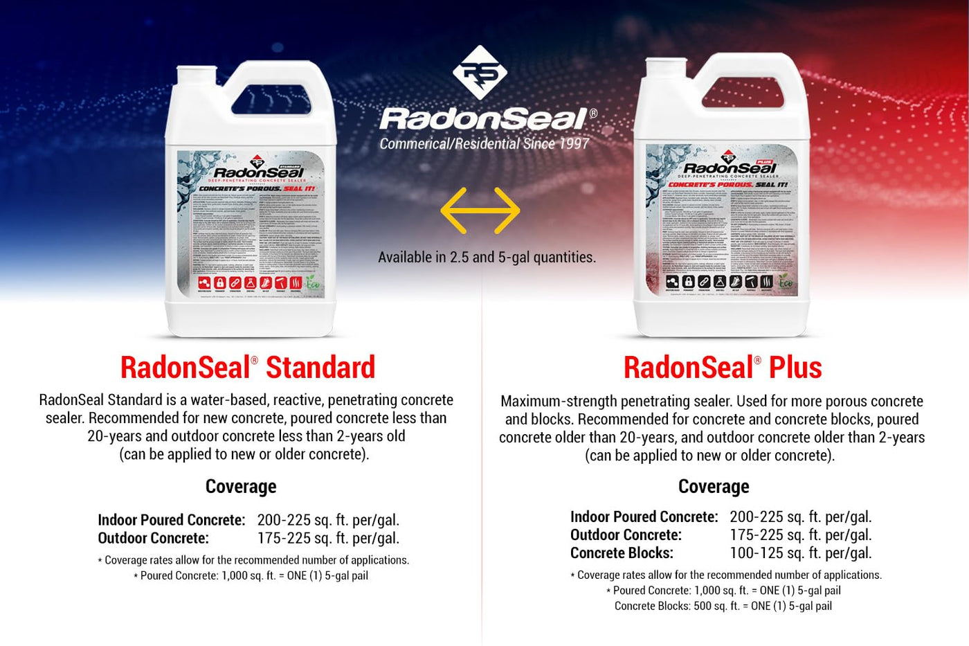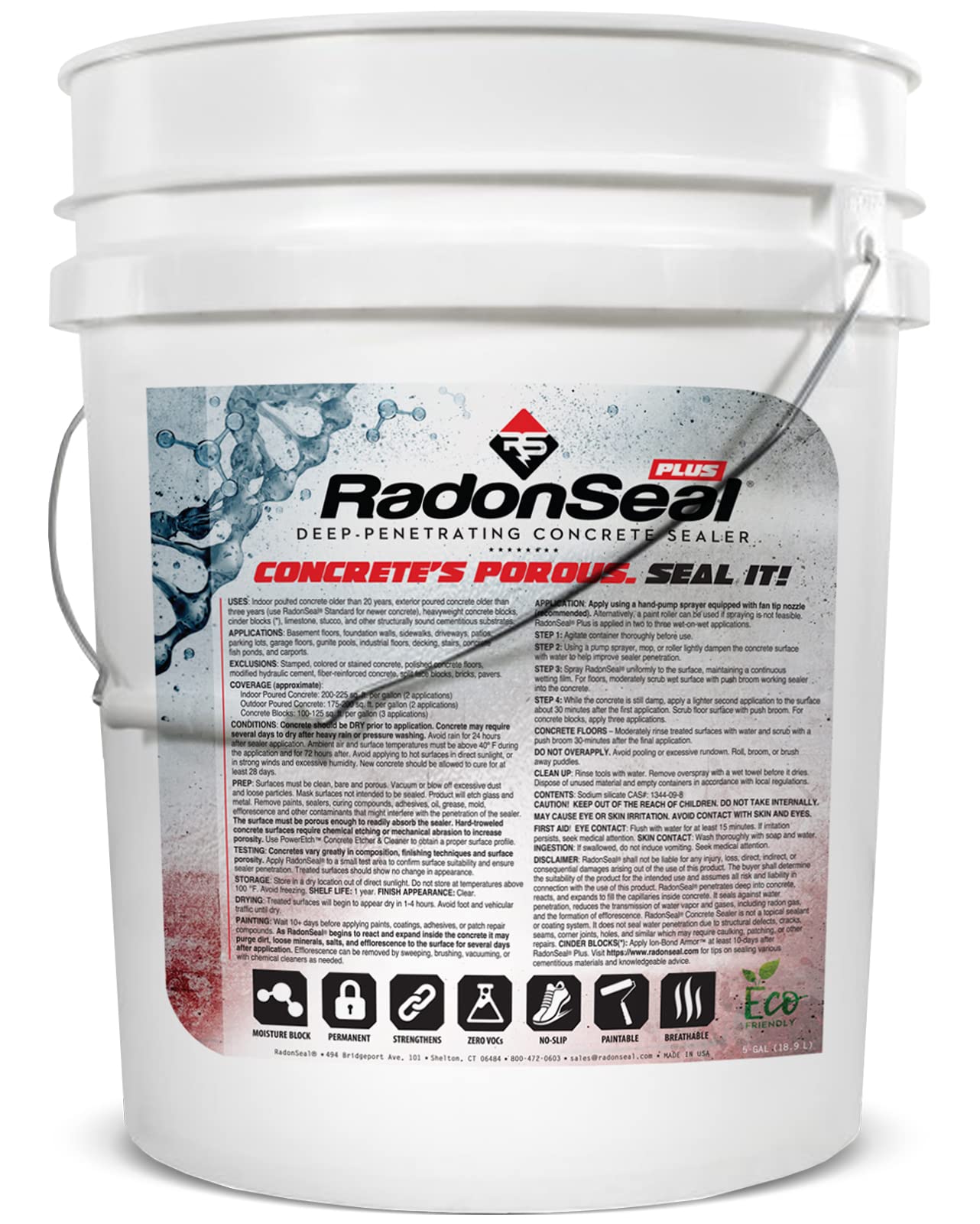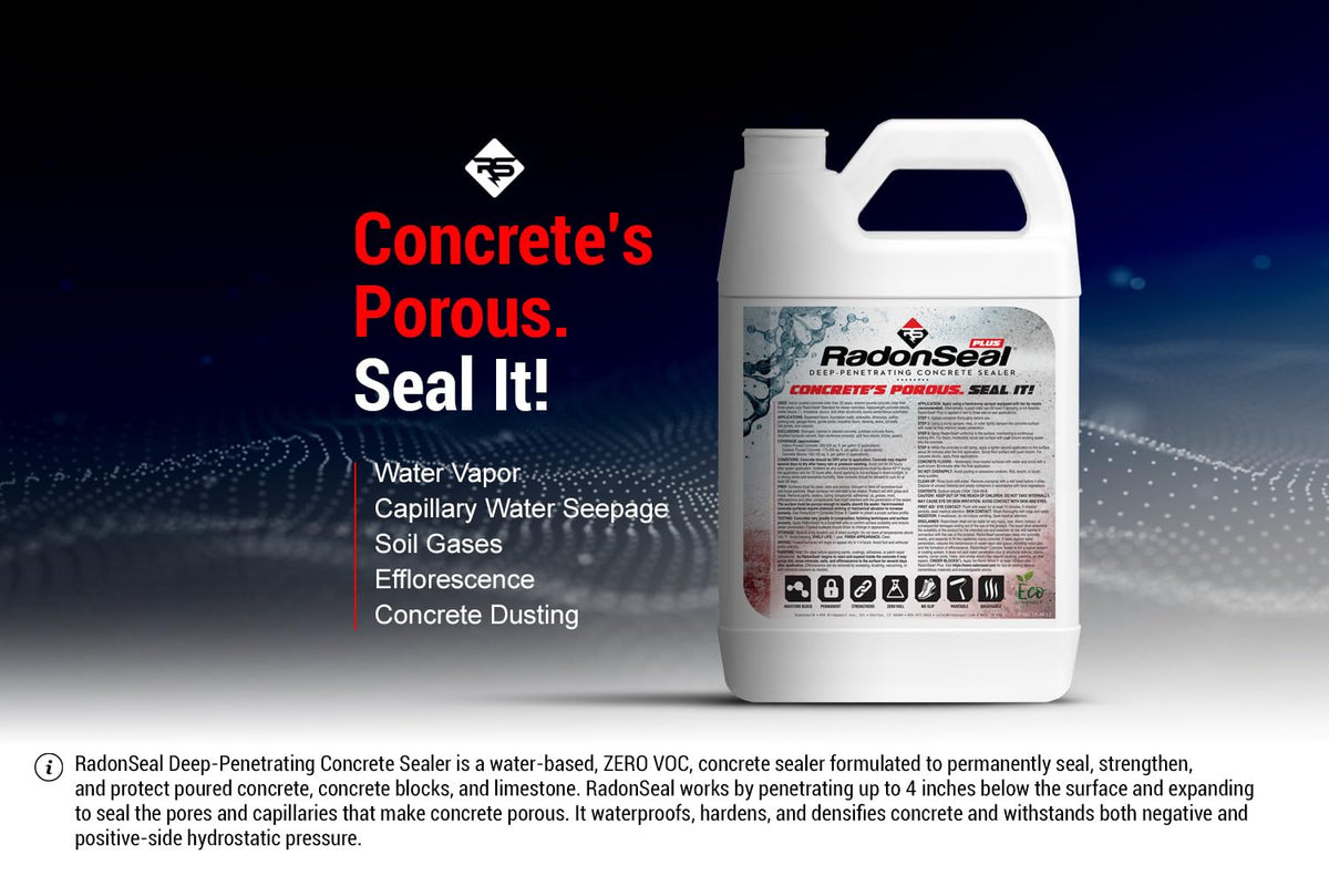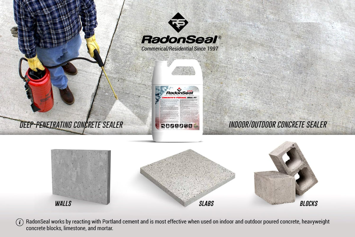 Trusted Since 1997 - RadonSeal offer contractors and homeowners unbiased expertise, unparalleled service, and our industry leading sealers and repair products. RadonSeal Deep-Penetrating Concrete Sealer is formulated to permanently seal poured concrete and concrete blocks. RadonSeal Penetrates into concrete (up to 4”), chemically reacts, and seals the capillaries and pores that make concrete porous. RadonSeal restricts moisture, water vapor, and radon gas infiltration through concrete. Prevents efflorescence, dusting, dampness, and humidity. Use RadonSeal to strengthen deteriorating concrete, harden compromised pours, and prevent pitting & spalling due to freeze-thaw, road salts, and deicing chemicals. ZERO VOCs. Eco-friendly. Safe Use Indoors. RadonSeal PLUS is formulated for concrete blocks, interior concrete > 20 years old; exterior concrete > 3 years old; and concrete with a history of seepage, regardless of age. RadonSeal STANDARD is for interior concrete < 20 years old; and interior concrete < 3 years old. USES: Basement floors, foundation walls, driveways, sidewalks, patios, garage floors, building facades, concrete barriers, and carports. (Note – Polished and other smooth-troweled surfaces may require etching or grinding).