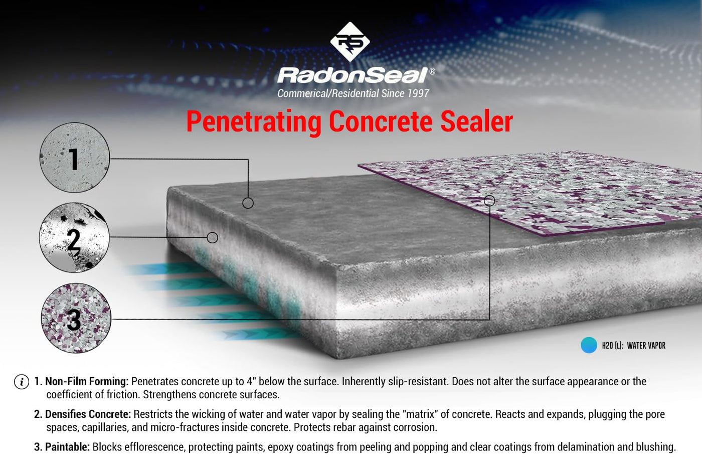 Q: How deep does RadonSeal penetrate concrete?A: RadonSeal penetrates into concrete up to 4 inches, sealing the capillaries and pores that contribute to moisture and gas infiltration.