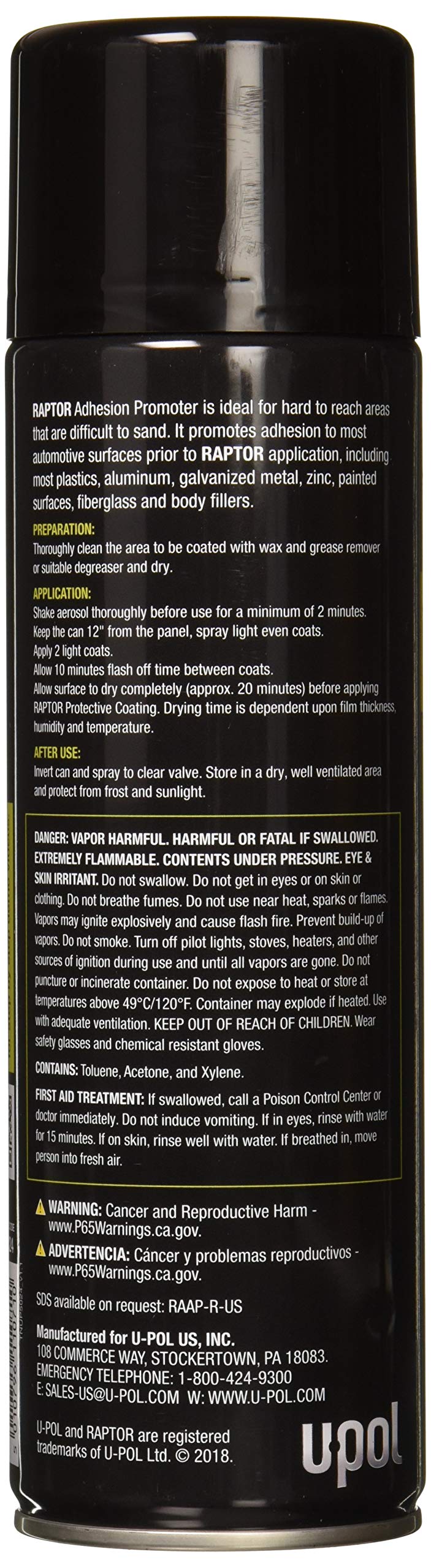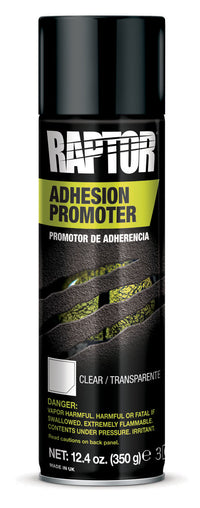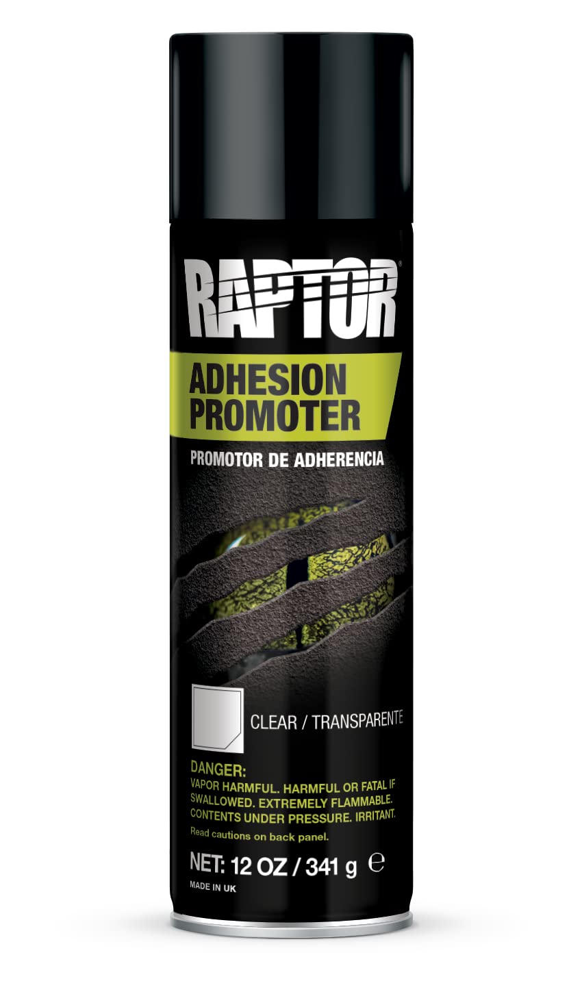 Q: What surfaces can the Raptor Adhesion Promoter be used on?A: The Raptor Adhesion Promoter is designed to promote paint adhesion on a variety of automotive surfaces, including plastics, aluminum, galvanized metal, zinc, painted surfaces, fiberglass, and even body fillers.