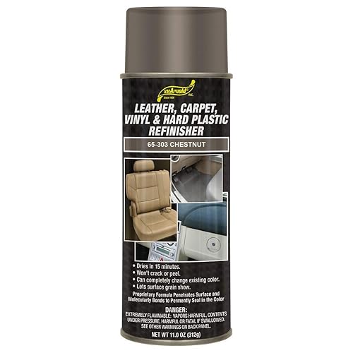 A tough, fade resistant refinisher that won't split, crack, peel or rub off. Use confidently to restore, renew, and rejuvenate carpet, leather, vinyl and plastic. Grain simulation is never altered or hidden no matter how many times it is applied. Dry to the touch in 90 seconds and adheres within 10 minutes. Use it to restore or change the original color. Professional grade refinisher formulated to protect and beautify interior and exterior surfaces. Perfect for Leather, Carpet, Vinyl, Metal, ABS Plastic, PVC, Polycarbonate, Polypropylene, Acrylic, Lexan, Fiberglass, and Recycled Plastics. Premium nozzle twists for both vertical and horizontal spray. VOC Complaint & UV enhanced stability. All dry times are based on 72 degrees F, 50 percent Humidity and 1.5 Mil Thickness.