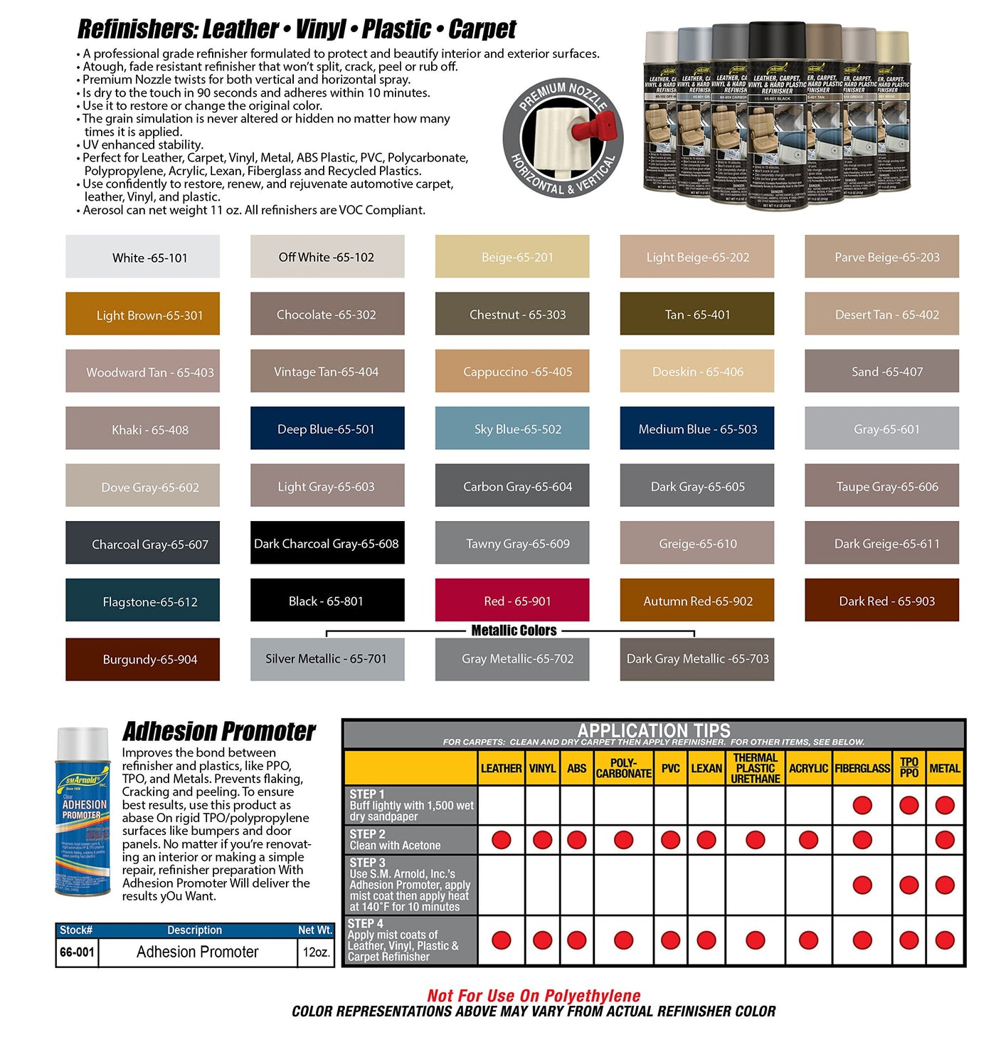 A tough, fade resistant refinisher that won't split, crack, peel or rub off. Use confidently to restore, renew, and rejuvenate carpet, leather, vinyl and plastic. Grain simulation is never altered or hidden no matter how many times it is applied. Dry to the touch in 90 seconds and adheres within 10 minutes. Use it to restore or change the original color. Professional grade refinisher formulated to protect and beautify interior and exterior surfaces. Perfect for Leather, Carpet, Vinyl, Metal, ABS Plastic, PVC, Polycarbonate, Polypropylene, Acrylic, Lexan, Fiberglass, and Recycled Plastics. Premium nozzle twists for both vertical and horizontal spray. VOC Complaint & UV enhanced stability. All dry times are based on 72 degrees F, 50 percent Humidity and 1.5 Mil Thickness.