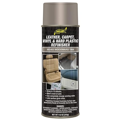 A tough, fade resistant refinisher that won't split, crack, peel or rub off. Use confidently to restore, renew, and rejuvenate carpet, leather, vinyl and plastic. Grain simulation is never altered or hidden no matter how many times it is applied. Dry to the touch in 90 seconds and adheres within 10 minutes. Use it to restore or change the original color. Professional grade refinisher formulated to protect and beautify interior and exterior surfaces. Perfect for Leather, Carpet, Vinyl, Metal, ABS Plastic, PVC, Polycarbonate, Polypropylene, Acrylic, Lexan, Fiberglass, and Recycled Plastics. Premium nozzle twists for both vertical and horizontal spray. VOC Complaint & UV enhanced stability. All dry times are based on 72 degrees F, 50 percent Humidity and 1.5 Mil Thickness.