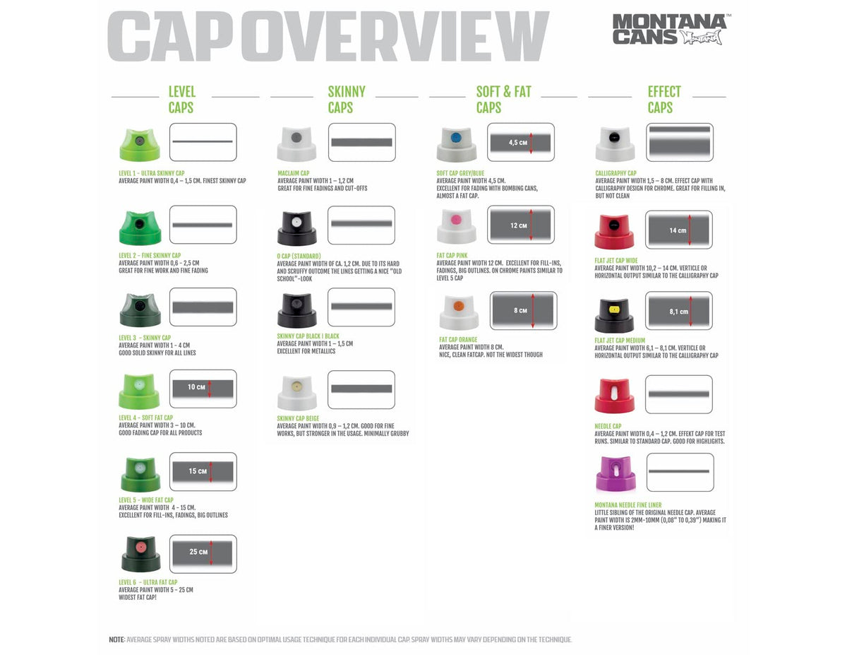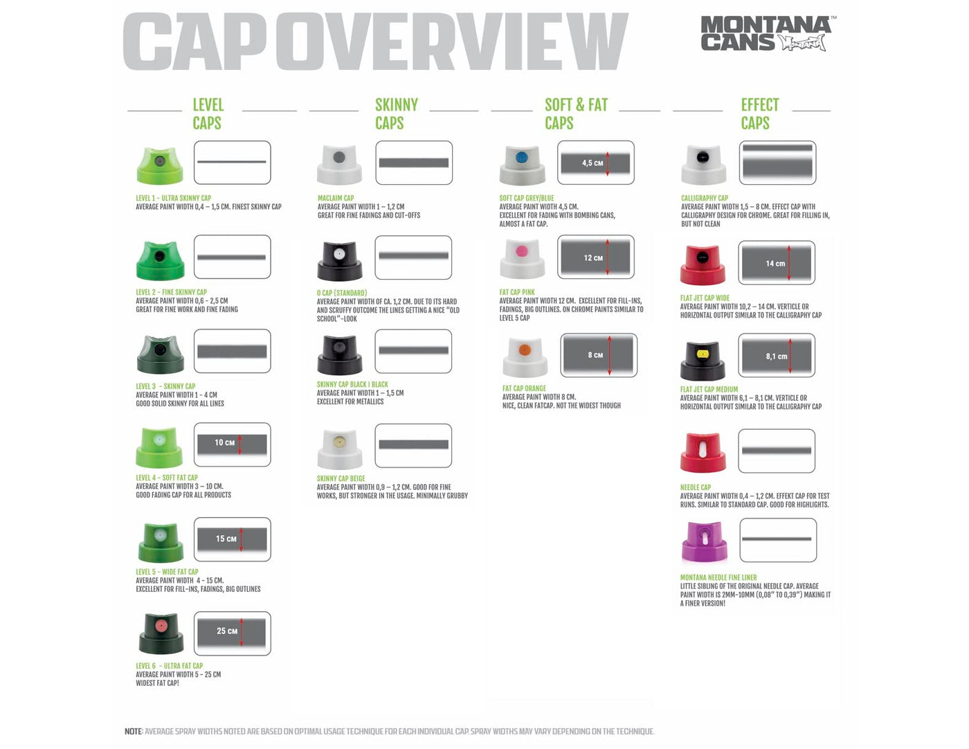 This set of 18 male caps can be interchanged on spray cans with female valves to get the right spray width for your artwork. Make the most of your spray paints! Compatible with Montana, Belton, and Ironlak. Some lines from Rustoleum, Krylon and Valspar are compatible with these caps, but not all - check that your cans will accept male caps before purchase. This set contains 18 caps manufactured by Montana: Standard O, Skinny Black, Skinny Beige, Orange Fat, Pink Fat, Soft Grey/Blue, Ma'Claim, Calligraphy, Needle Medium Liner, Needle Fine Liner, Flatjet Wide, Flatjet Medium, and all 6 Green caps- from Ultra Skinny to Ultra Wide.