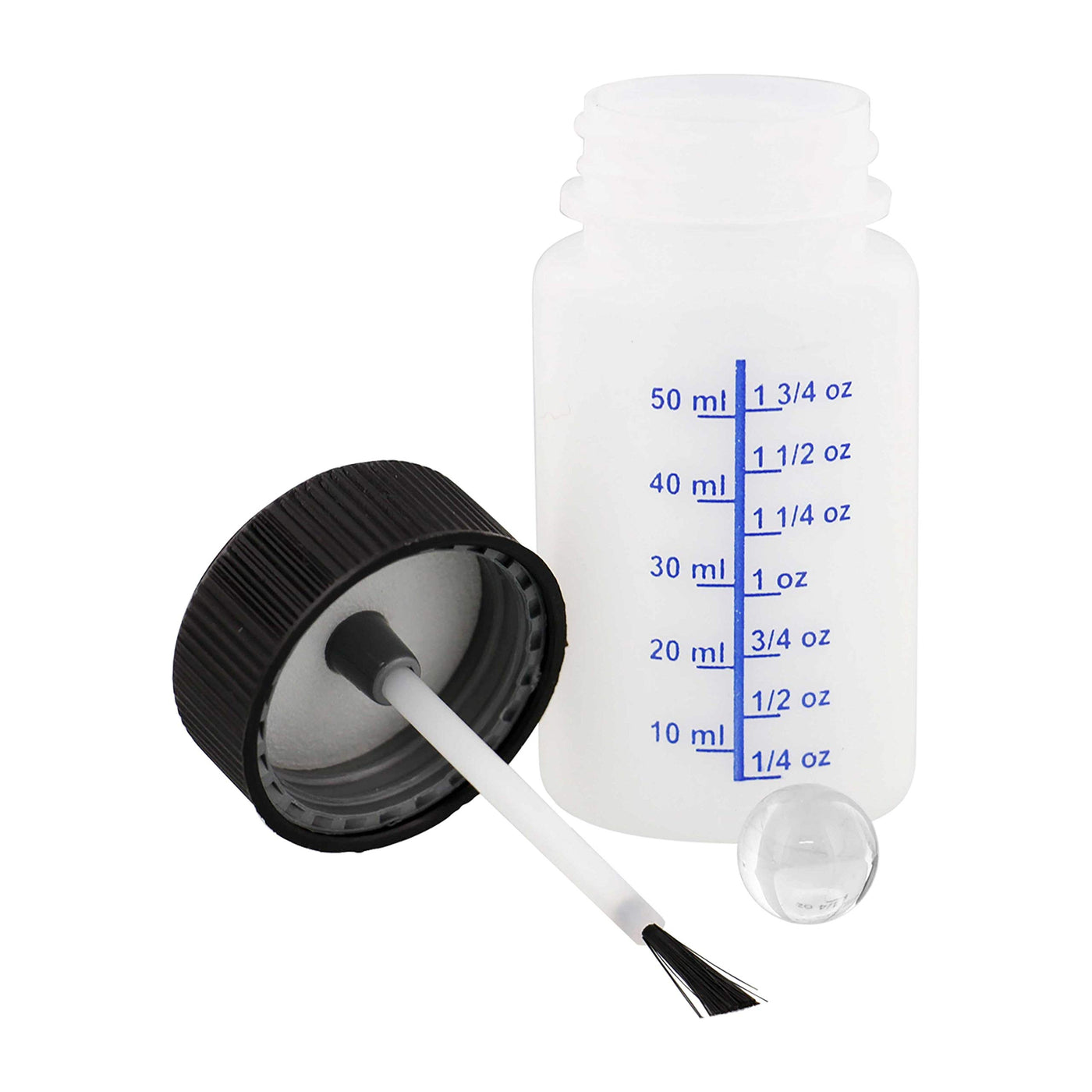 (Box of 100) - Touch Up Bottles with a 60 ml liquid capacity (2 Ounce) and they include a child safety lid, paint brush and a paint mixing ball | Bottles have gradient markings for every 1/4 ounce increment and for every 10 ml increment | Lids contain convenient paint touch up brushes | Made with solvent resisant HDPE plastic material | Bottle Size: 1-3/5 (400mm) Wide x 2 (76mm) High