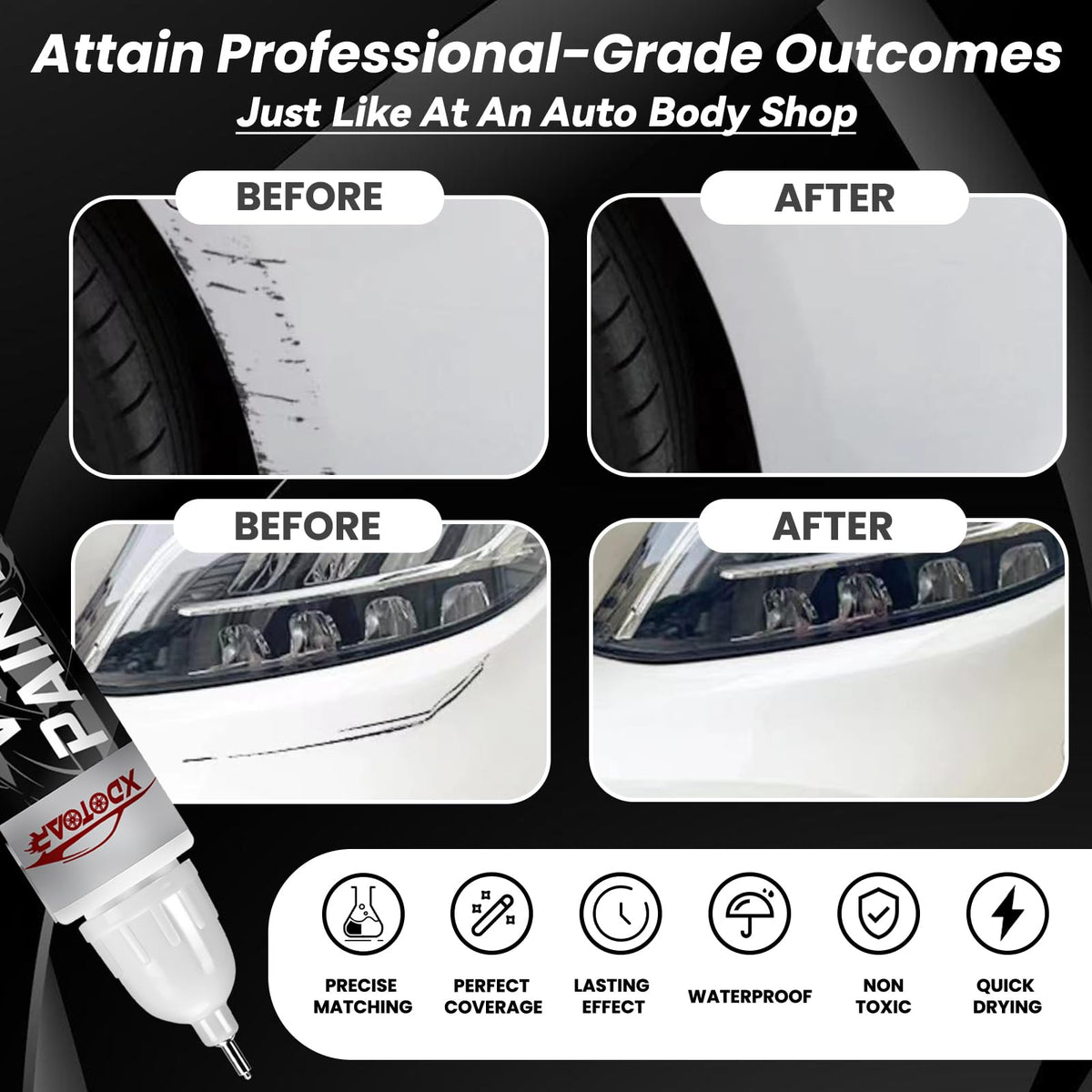 Effective Car Scratch Remover - Our White Car Paint Touch Up Pen, Made With Premium Materials And Advanced Technology, Is Thick Enough For A Smooth, Even, And Glossy Finish. It Quickly Repairs Scratches And Paint Damage, Blends Seamlessly With The Original Paint, Covers Marks Invisibly, And Restores Your Car To Like-New Condition.