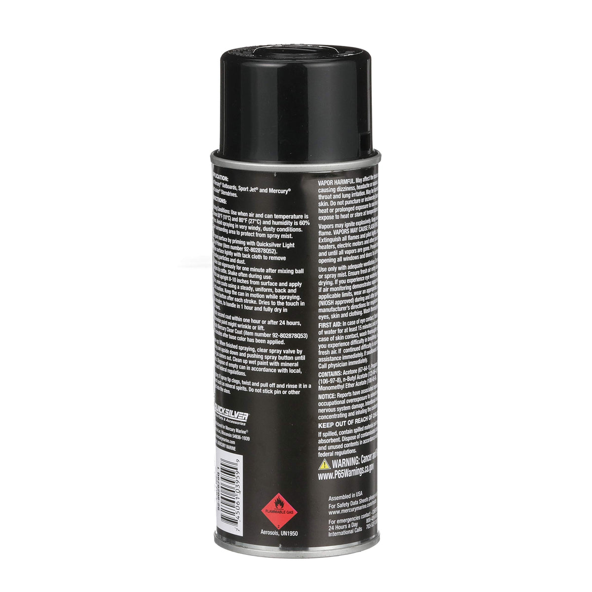 Phantom Black spray paint 802878Q1. 12 ounce spray can of glossy black enamel paint to match black Mercury outboards or MerCruiser sterndrives and engines. Classic black color to cover worn or scratched surfaces.The Quicksilver brand is the leader in delivering uncompromising engine oils, parts and accessories to the marine industry for over 65 years. Quicksilver is the premier supplier of Mercury Marine Original Equipment replacement engine parts, oils, and accessories, but also works to serve all Original Equipment brands in the marine and powersports industries. It has earned a loyal following by providing the highest quality products that are tested through some of the most rigorous environments and testing procedures. No aftermarket company comes close to the level of research and design as Quicksilver; buying Quicksilver is buying performance, protection and peace of mind.