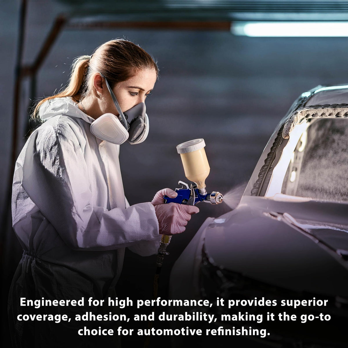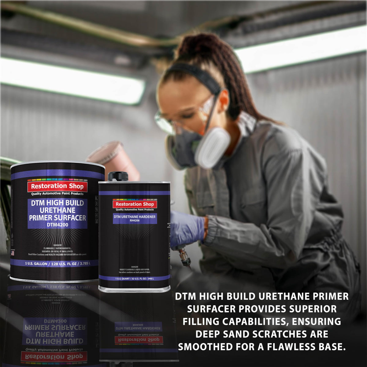 Upgrade your refinishing project with the Restoration Shop 1.25 Gallon Premium High Solids High-Build 2K Primer Auto Paint Kit. This complete professional-grade kit includes 1 gallon of gray urethane primer surfacer and 1 quart of urethane hardener, providing a 4:1 mix ratio to make 1.25 gallons of sprayable 2K primer. Engineered for performance, this high-build urethane primer surfacer and sealer offers superior filling capabilities thanks to its high solids content-ideal for filling medium to deep sand scratches. Whether youre working on bare metal, previously painted surfaces, body filler, or properly prepped automotive plastics, our DTM4200 direct-to-metal formula delivers excellent adhesion and results. Experience outstanding color holdout under all urethane finishes, with zero shrinkage. This fast-drying primer sands easily-wet or dry-without loading your sandpaper. It can also be tinted using primer tints or base coat toner to match your specific project needs. Proudly made and distributed in the USA, Restoration Shop uses only the highest-quality ingredients to produce premium coatings that deliver consistent, professional-grade results. Whether you're restoring a classic or refinishing a modern vehicle, trust Restoration Shop to help you get it done right the first time.