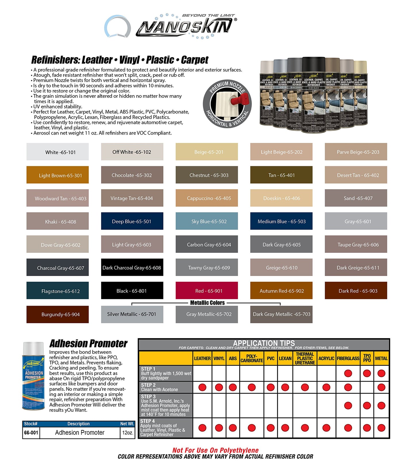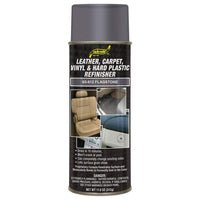 A tough, fade resistant refinisher that won't split, crack, peel or rub off. Use confidently to restore, renew, and rejuvenate carpet, leather, vinyl and plastic. Grain simulation is never altered or hidden no matter how many times it is applied. Dry to the touch in 90 seconds and adheres within 10 minutes. Use it to restore or change the original color. Professional grade refinisher formulated to protect and beautify interior and exterior surfaces. Perfect for Leather, Carpet, Vinyl, Metal, ABS Plastic, PVC, Polycarbonate, Polypropylene, Acrylic, Lexan, Fiberglass, and Recycled Plastics. Premium nozzle twists for both vertical and horizontal spray. VOC Complaint & UV enhanced stability. All dry times are based on 72 degrees F, 50 percent Humidity and 1.5 Mil Thickness.
