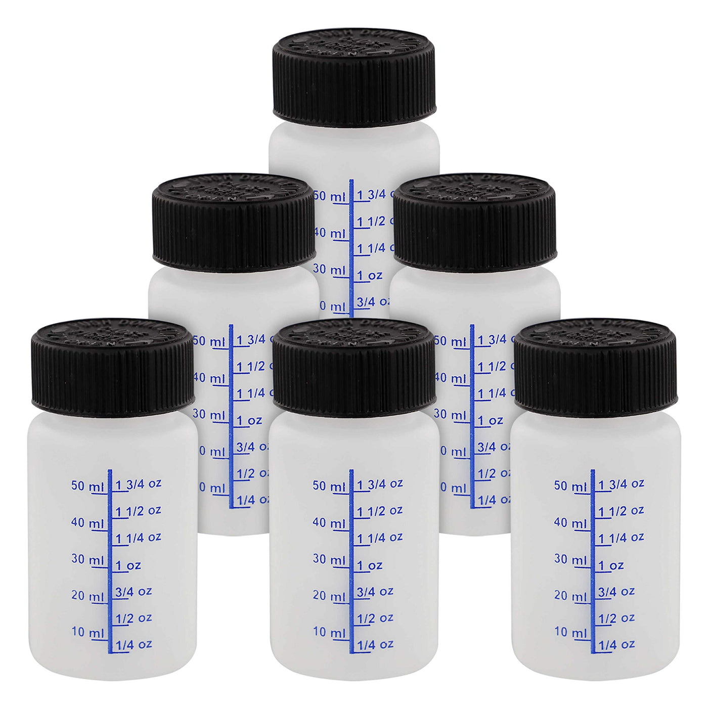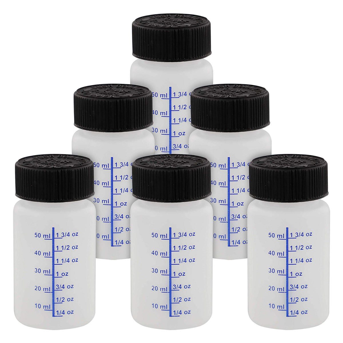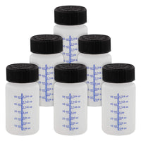 6-Pack - Touch Up Bottles with a 60 ml liquid capacity (2-Ounce) and they include a child safety lid, paint brush and a paint mixing ball | Bottles have gradient markings for every 1/4 ounce increment and for every 10 ml increment | Lids contain convenient paint touch up brushes | Made with solvent resisant HDPE plastic material that can withstand any Solvent or Water Based Paint, Lacquer, or Stain | Bottle Size: 1-3/5'' (400mm) Wide x 2'' (76mm) High