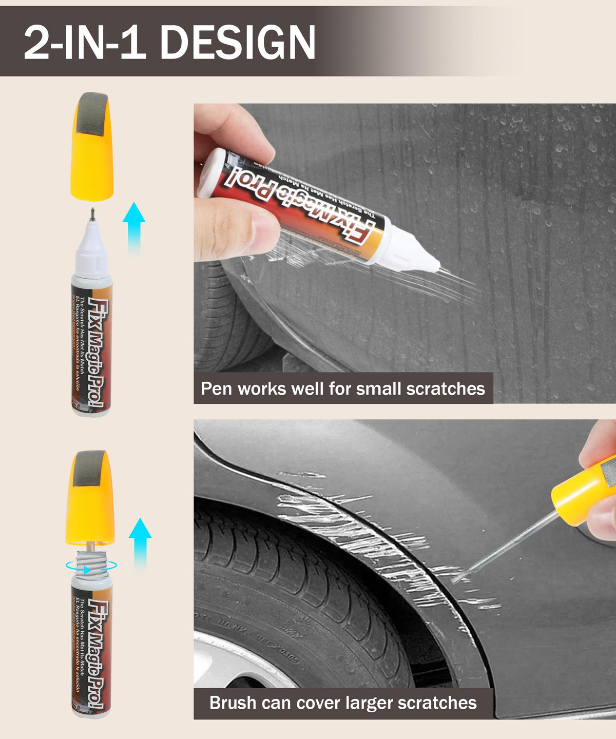 Colors: black, white, silver, blue, red, green, yellow< br > < br > What will you get in the box?< br > -1 x car paint scratch repair pen< br > < br > Our product advantages:< br > -Helps you quickly repair, seal scratches, make car paint look great, and protect your car< br > -Dual end design, portable, easy to use< br > -Strong adhesion, rust proof and waterproof, reusable< br > -After use, it will make the car's paint more glossy< br > -The color difference between the repaired car paint and the original car paint is harmonious, natural, and long-lasting< br > -Can be used for plastic roofs, doors, engine hoods, and even bumpers; Metal, fiberglass, and PVC< br >