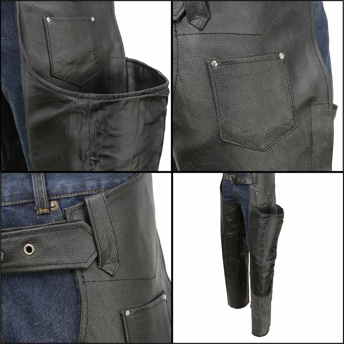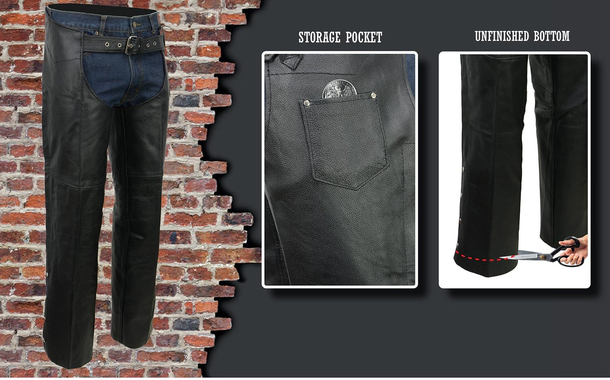 Features Made of Durable Cowhide Grade 1.2-1.3mm Thick Leather Classic Leather Chap Design with Coin Pocket Adjustable Waist Belt Zipper Closure Snap Button Closure Mesh Quilted Liner for Warm Weather Unhemmed-Cut to Your Fit Genuine YKK Zippers - Known for Durability and Longevity Motorcycle Chaps Made with Genuine Cowhide Leather. This Motorcycle Men’s Leather Pants Are Not Only Stylish but Also Incredibly Durable and Long-Lasting. The Genuine Leather Pants Are Made of High-Quality Materials and Are Designed to Withstand the Wear and Tear of Everyday Use While Riding. Material: Real Leather Chaps Made with Combination of Waterproof and Breathable Materials, That Is Reinforced with A Special Treatment to Keep You Dry During Wet Rides Against to The Rain and Wind While Out on The Highway and Also Keep You Warm in Cold Weather and Winter Season. Leather Chaps for Men Is Also Lightweight, Making It Easy to Wear Them Even During Hot Summer Rides. Motorcycle Chaps: Our Black Leather Chaps Are Perfect for All Motorcyclists. This Leather Biker Apparel Provides Protection from Accidental Falls. Motorcycle Riding Pants Come Equipped with A Zipper and Inner Mesh Quilted Liner for Added Breathability. It Has Stainless Belt Buckle for A Secure and Adjustable Fit. Riding in Style and Safety: The Motorcycle Gear and Accessories Are Made for Adults. This Product Offers the Perfect Fit for Men and Women Biker. This Motorcycle Pants Feature a Snap Closure with Adjustment, Making It Easy to Put on And Take Off While Ensuring a Perfect Fit Hardware: Easily Slip-On Over Jeans to Ride a Motorcycle, Featuring the YKK Hardware Zipper Along the Side That Extends and Snaps at The Bottom with A Wind Flap to Block the Cold Air from Coming In