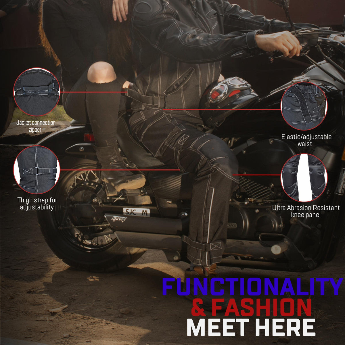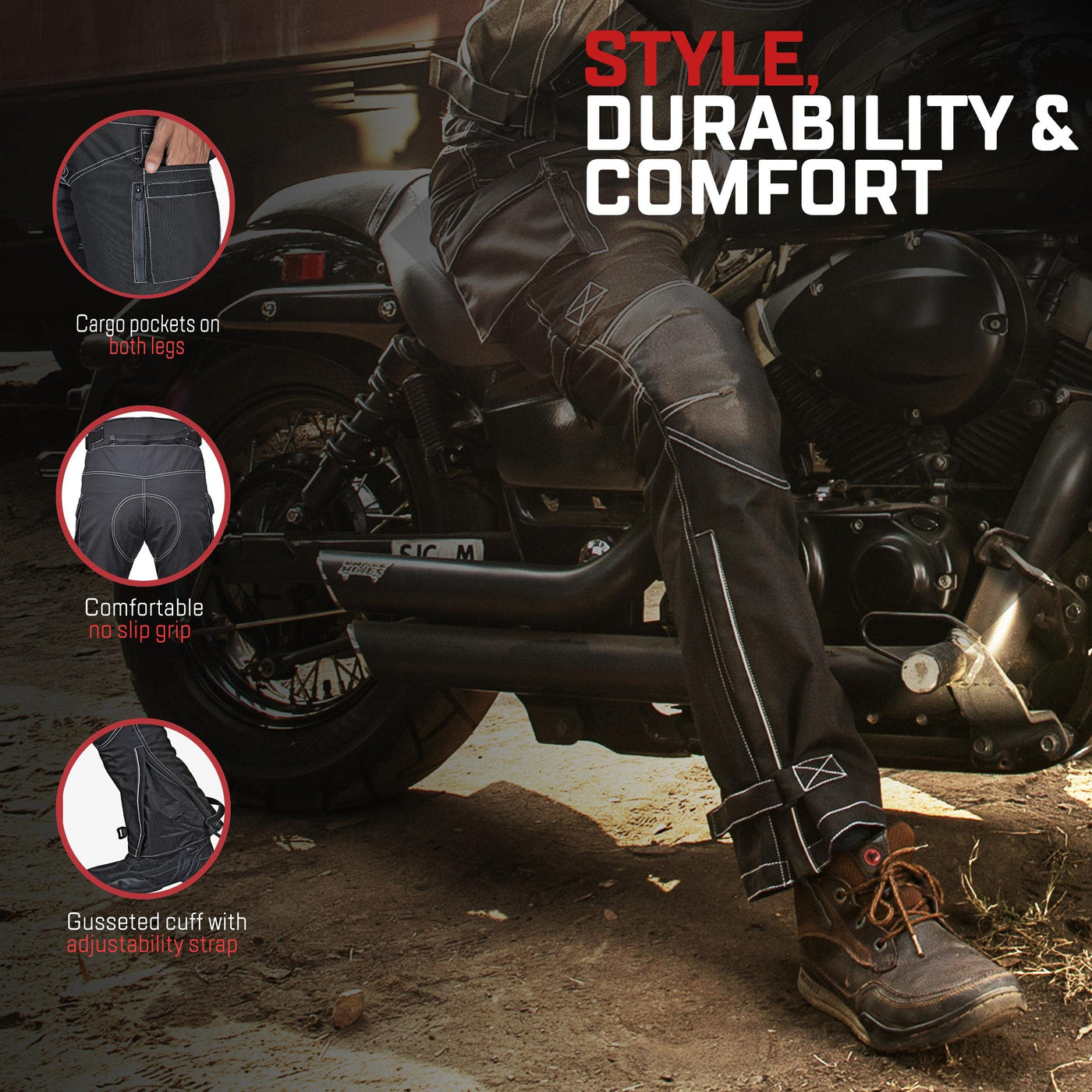 These are WICKED STOCK white stitched 600D motorcycle riding pants for men. These motorcycle pants for men are fully waterproof and come pre-installed with CE rated Knee and Hip armor. Knee armor in these enduro pants is height adjustable. These are motorcycle riding pants and measure different than your regular jeans. So, your regular jeans or pants measurement is totally irrelevant. Measure around your belly button, using a cloth tape measure and don't pull it tight. Measure your inseam from the highest point of your crotch down to your ankle, along your inner leg. Compare these measurements to the sizing chart in picture gallery. These motorcycle cargo pants will become your favorite gear as these are rugged while comfortable to wear. These protective pants have all CE Level-1 armor for your protection and safety. These riding pants for men are also vented motorcycle pants.