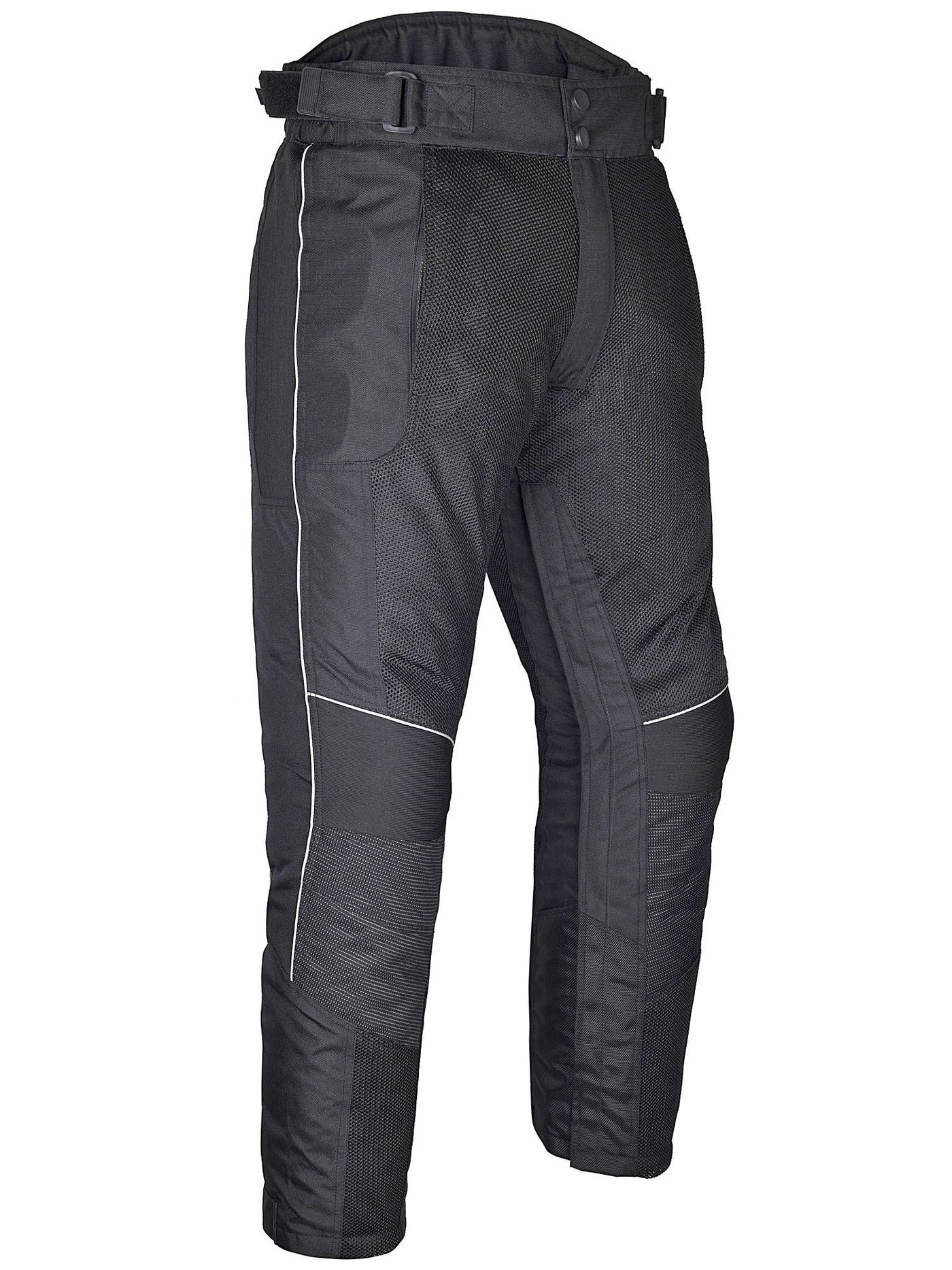 PLEASE READ SIZING CHART IN PICTURES. THESE summer motorcycle pants MEASURE VERY DIFFERENT THAN REGULAR PANTS. YOUR JEANS OR PANTS SIZE IS IRRELEVANT. PLEASE MEASURE YOURSELF UP AND USE THE SIZING CHART AS A GUIDE. PLEASE REACH OUT TO US FOR ANY SIZING QUESTIONS. These summer motorcycle pants mens come in regular, short, and tall inseam sizes. Two elegant color choices; an all-black and all-gray. These dirt bike pants have a durable and highly abrasion resistant 600 Denier Polyester Shell. These motocross pants feature extensive mesh paneling on front, back and lower leg for massive air flow. CE rated knee and hip armor and generous reflective piping on front and back for added safety and nighttime visibility.