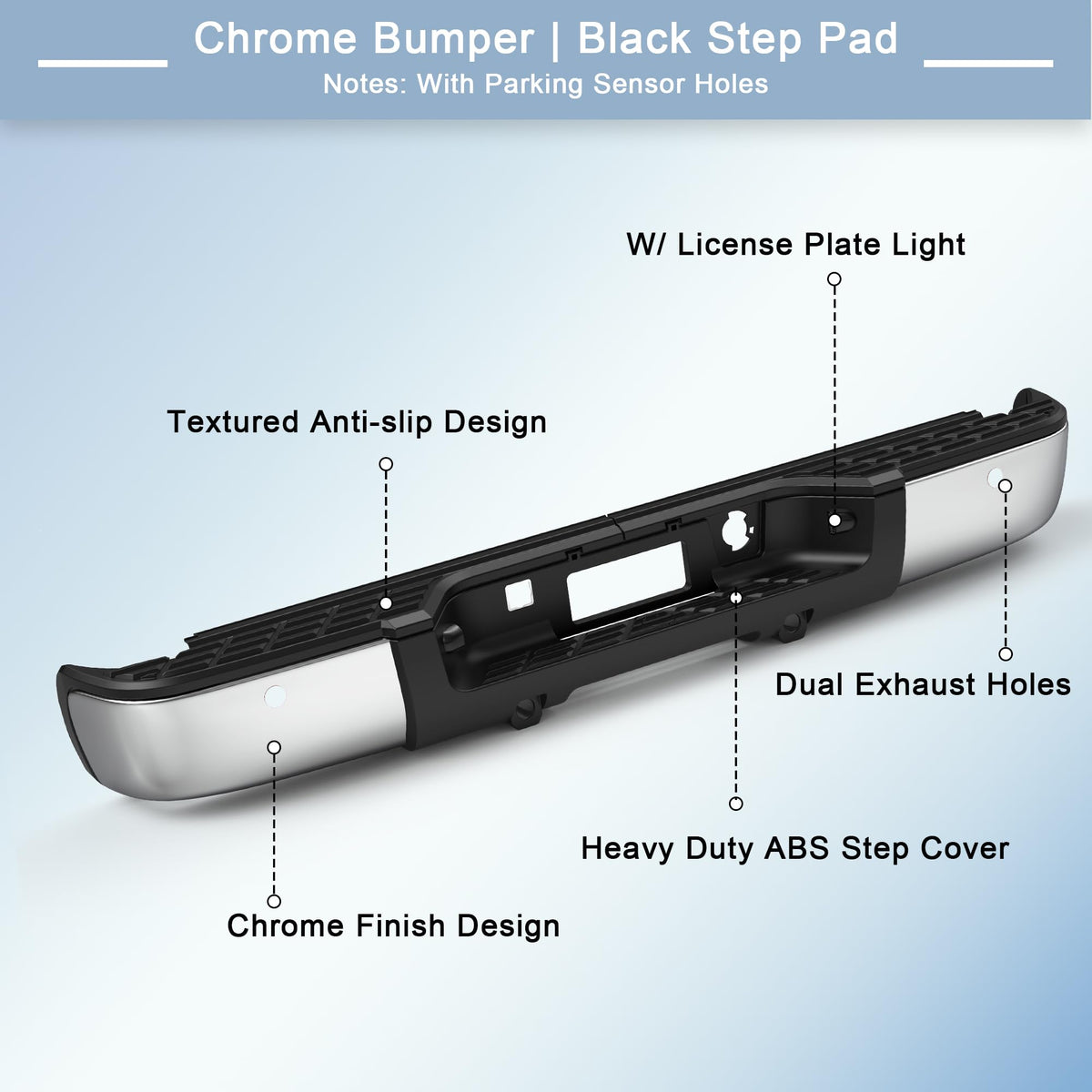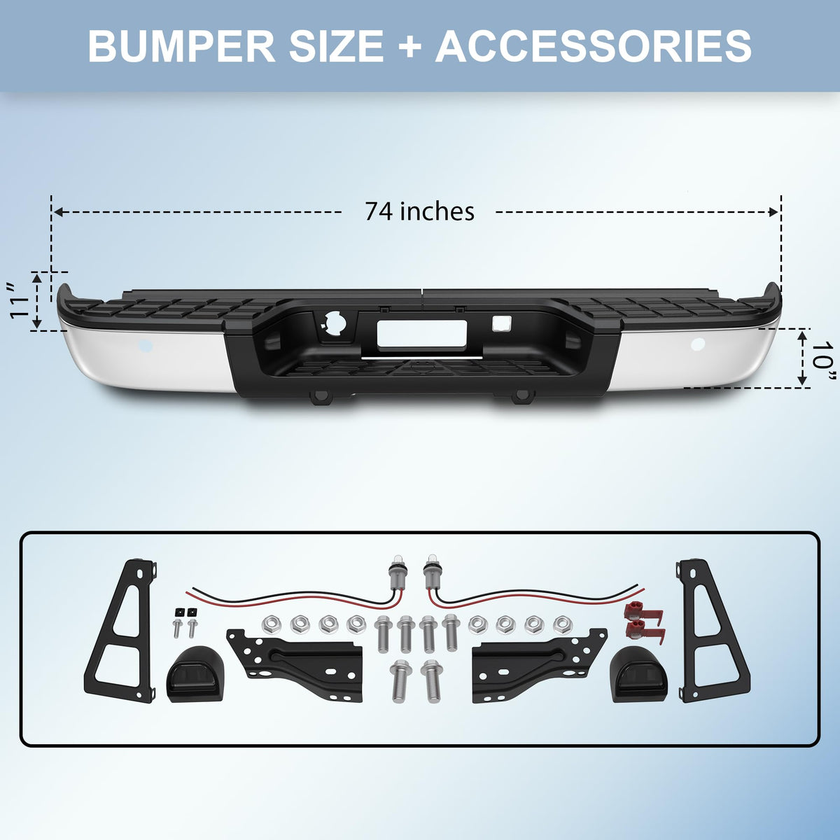 [VEHICLE COMPATIBILITY] -- Compatible for 2007-2013 Chevy Chevrolet Silverado 1500, Compatible for 2007-2013 GMC Sierra 1500, ( exclude Silverado/Sierra 2500 3500 model ) | [Product Detail] -- Part number: Compatible for 20899360, GM1103148, 20899360PFM, CV40236B, CV8521020B0 (notes: Fit For without Rear Park Assist Sensor Holes Models Only) | [PROTECTION FUNCTION] -- This rear bumper can absorb and slow down the external impact for your car, protect the vehicle and passengers when the car is in a collision, reduce the risk of injury | [DETAILED DESIGN] -- The rear bumper is made of high quality steel and lightweight ABS plastic. No additional drilling or cutting is required. It also has a certain decorative effect to improve the overall aesthetics of the car | [DIRECT INSTALLATION] -- Easy and quick to install, no need to turn holes for direct installation. The package contains the needed accessories - mounting brackets and screws. Installation can be completed within half an hour using basic hand tools