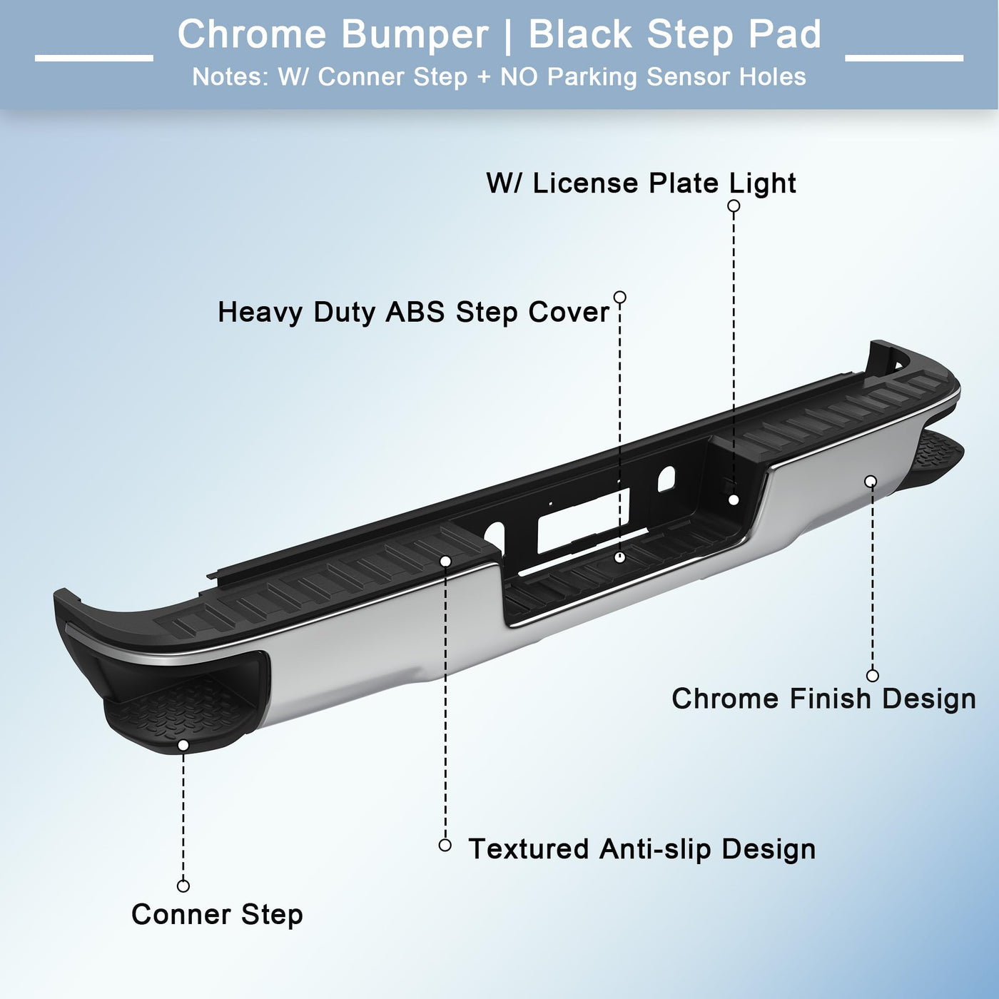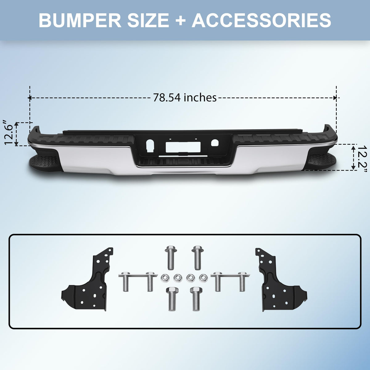 [VEHICLE COMPATIBILITY] -- Rear bumper Assembly Compatible for 2014-2018 Chevy Silverado 1500, Compatible for 2014-2018 GMC Sierra 1500 | [Bumper Details] --Replace Par#: Compatible for 23154012, GM1103176. (notes: Fit For without Rear Park Assist Sensor Holes Models Only) | [PROTECTION FUNCTION] -- The Chevrolet Silverado rear bumper can absorb and slow down the external impact for your car, protect the vehicle and passengers when the car is in a collision, reduce the risk of injury | [DETAILED DESIGN] -- The rear bumper is made of high quality steel and lightweight ABS plastic. No additional drilling or cutting is required. It also has a certain decorative effect to improve the overall aesthetics of the car | [DIRECT INSTALLATION] -- Easy and quick to install, no need to turn holes for direct installation. The package contains the needed accessories - mounting brackets and screws. Installation can be completed within half an hour using basic hand tools