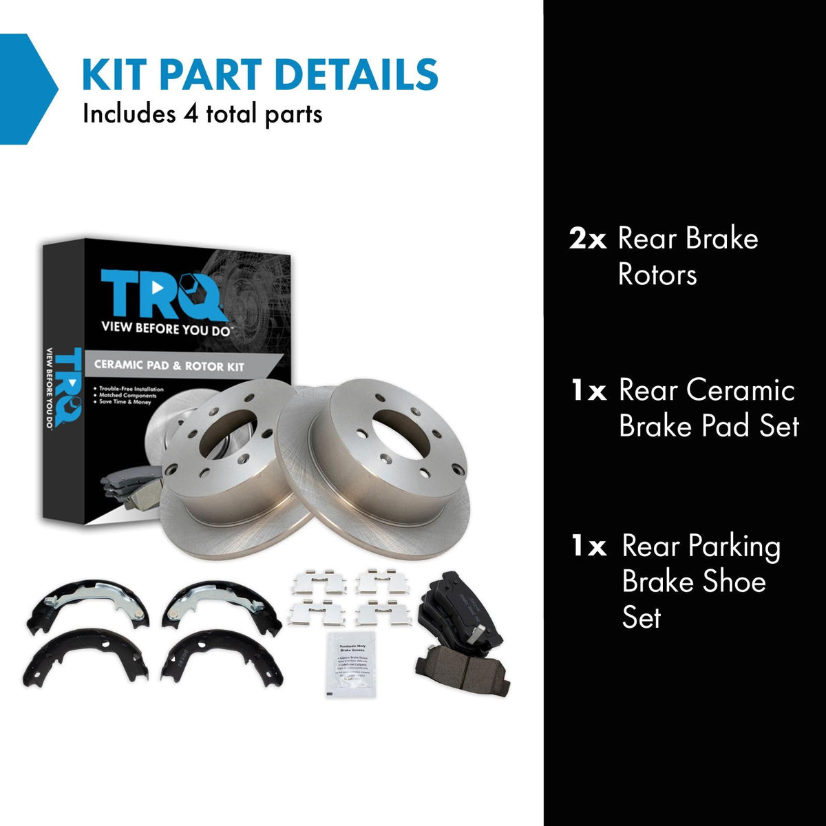 Ceramic Brake Pad & Rotor KitKit Includes(1) Rear Ceramic Brake Pad Set(1) Rear Parking Brake Shoe Set(2) Rear Brake RotorsFitmentCompatible with: 1999-05 Hyundai Sonata Rear with Parking ShoesCompatible with: 2001-05 Kia Optima Rear with Parking ShoesCompatible with: 2006 Kia Optima Rear with 4 Lug Wheels with Parking ShoesProduct AttributesBrake Pad Friction Material: CeramicProduct Features Positive Molded - Less dust resulting in clean wheels G3000 Casting Alloy - Reduced noise and improved wear resistance Application Specific Design - Extended service life, no modificationsItem DetailsTRQ brake kits are designed to restore your brake system to like-new performance. TRQ brake pads are positive molded, thermal scorched, chamfered, and utilize a multi-layer shim for enhanced performance and service life. TRQ rotors have a non-directional finish that reduces the break-in period for new rotors as well as reducing vibrations throughout the rotors lifecycle. All products are fit and road-tested in our Massachusetts R&D facility to ensure we deliver on our promise of Trusted Reliable Quality.Reference NumbersAimco: 31333Bendix: PRT5532DuraGo: BR31333Hollander: 533-58547Hyundai: 5830226A20, 583022EA00, 583022HA00, 5830238A10, 583023KA10, 583023KA50, 583023KA51, 583023KA60Kia: 583022EA00, 5830238A10, 583023FA00Raybestos Brakes: 889PG, 980054, 980054FZN, 980054P, 980054R, EHT813H, MGD813CH, SGD813CWagner Brake: Z889Wagner: BD126166