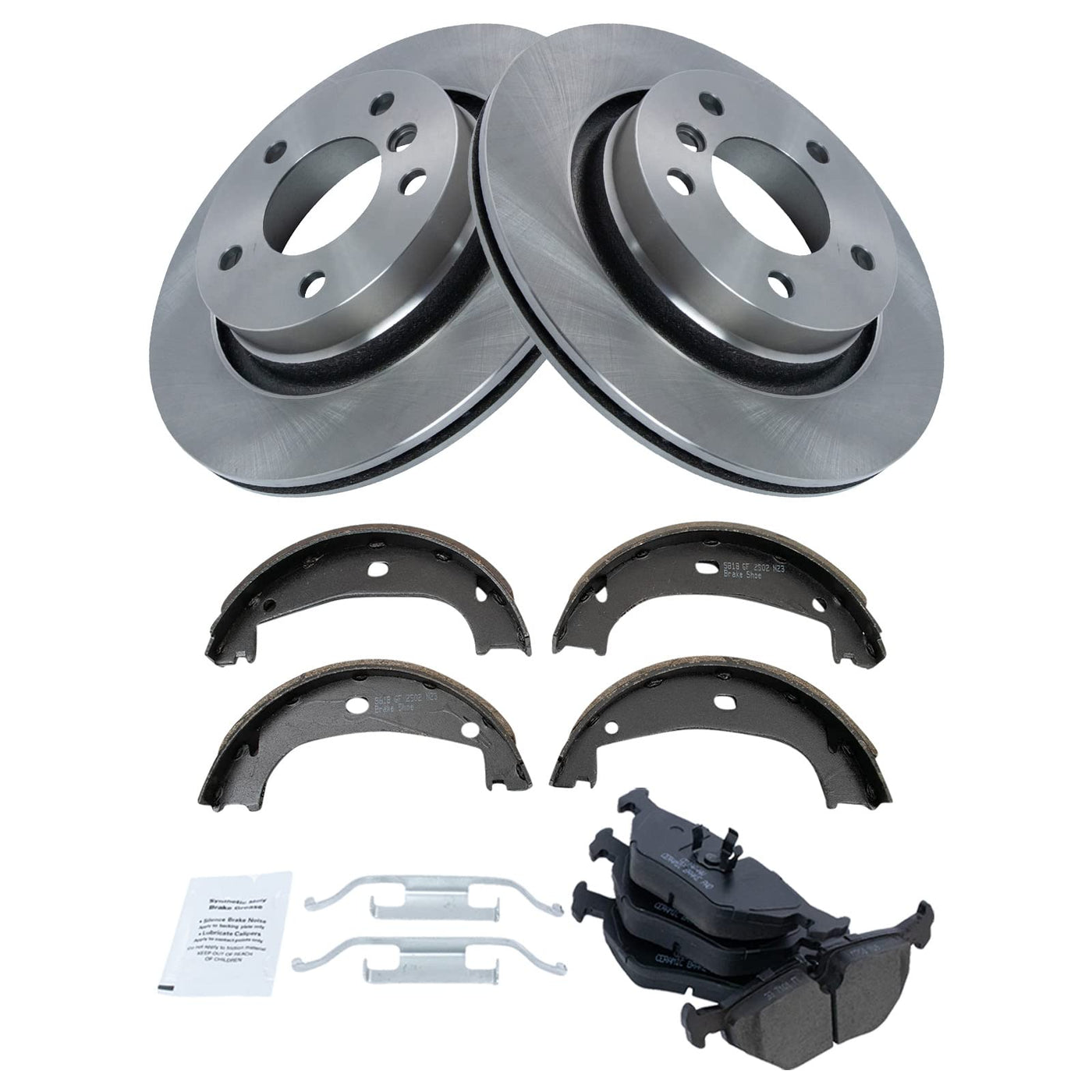 Ceramic Brake Pad & Rotor KitKit Includes(1) Rear Ceramic Brake Pad Set(1) Rear Parking Brake Shoe Set(2) Rear Brake RotorsFitmentCompatible with: 1999 BMW 328i Rear with Parking ShoesProduct AttributesBrake Pad Friction Material: CeramicProduct Features Positive Molded - Less dust resulting in clean wheels G3000 Casting Alloy - Reduced noise and improved wear resistance Application Specific Design - Extended service life, no modificationsItem DetailsTRQ brake kits are designed to restore your brake system to like-new performance. TRQ brake pads are positive molded, thermal scorched, chamfered, and utilize a multi-layer shim for enhanced performance and service life. TRQ rotors have a non-directional finish that reduces the break-in period for new rotors as well as reducing vibrations throughout the rotors lifecycle. All products are fit and road-tested in our Massachusetts R&D facility to ensure we deliver on our promise of Trusted Reliable Quality.Reference NumbersAimco: 34220Bendix: PRT5417BMW: 34211157334, 34211157814, 34211158221, 34211160198, 34211160199, 34211160533, 34211162536, 34212226092DuraGo: BR34220Hollander: 533-58560Raybestos Brakes: 818PG, 980127, 980127FZN, 980127P, 980127R, PGD396MWagner Brake: Z818Wagner: BD126247