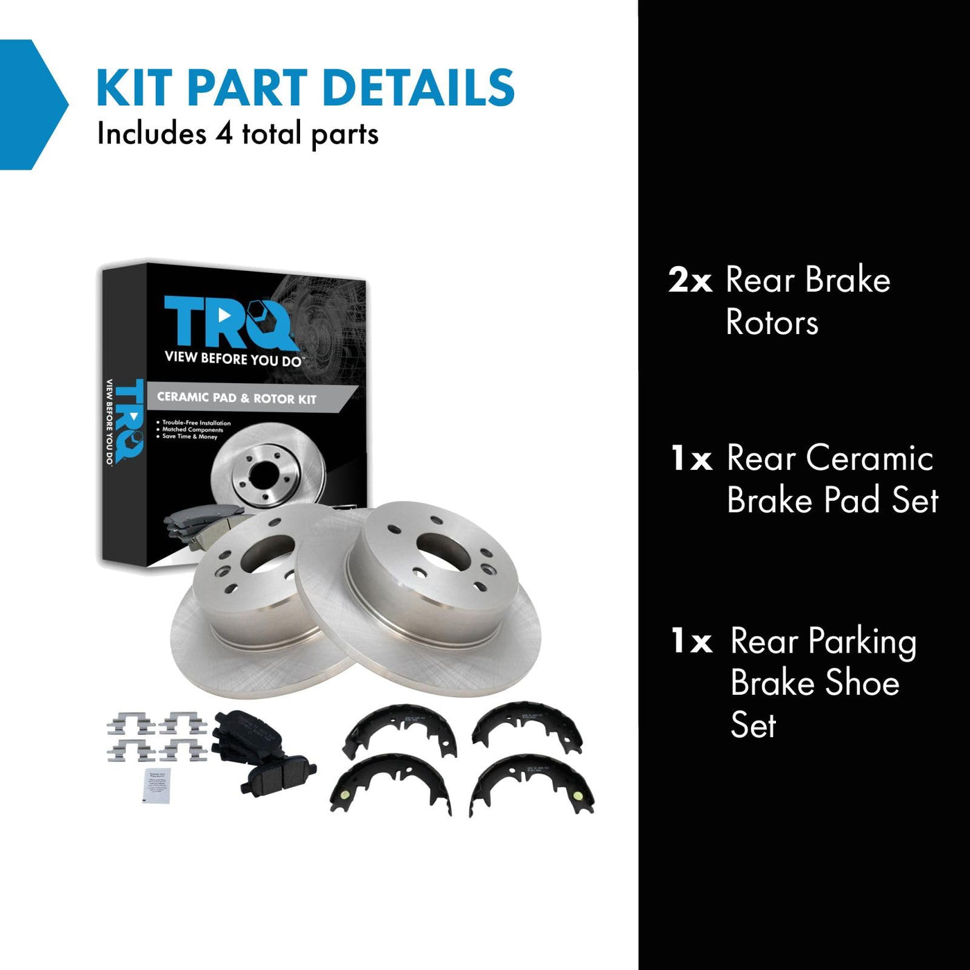 Ceramic Brake Pad & Rotor KitKit Includes(1) Rear Ceramic Brake Pad Set(1) Rear Parking Brake Shoe Set(2) Rear Brake RotorsFitmentCompatible with: 2000-04 Toyota Avalon Rear with Parking ShoesProduct AttributesBrake Pad Friction Material: CeramicProduct Features Positive Molded - Less dust resulting in clean wheels G3000 Casting Alloy - Reduced noise and improved wear resistance Application Specific Design - Extended service life, no modificationsItem DetailsTRQ brake kits are designed to restore your brake system to like-new performance. TRQ brake pads are positive molded, thermal scorched, chamfered, and utilize a multi-layer shim for enhanced performance and service life. TRQ rotors have a non-directional finish that reduces the break-in period for new rotors as well as reducing vibrations throughout the rotors lifecycle. All products are fit and road-tested in our Massachusetts R&D facility to ensure we deliver on our promise of Trusted Reliable Quality.Reference NumbersAimco: 31268Bendix: PRT5292DuraGo: BR31268Hollander: 533-58572Lexus: 4654020040, 4654020060, 4654020070, 4654033010Raybestos Brakes: 96932, 96932FZN, 96932P, 96932R, EHT828H, MGD828CH, SGD828CToyota: 446606030, 446633060, 446633080, 446641020, 4654007010, 4654020010, 4654020040, 4654020060, 4654020070, 4654033010, 4655020040, 4659020040, 4659033020Wagner: BD126000