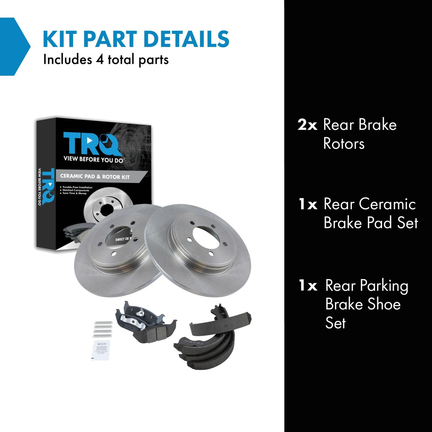 Ceramic Brake Pad & Rotor KitKit Includes(1) Rear Ceramic Brake Pad Set(1) Rear Parking Brake Shoe Set(2) Rear Brake RotorsFitmentCompatible with: 2003-05 Lincoln Aviator Rear with Parking ShoesProduct AttributesBrake Pad Friction Material: CeramicProduct Features Positive Molded - Less dust resulting in clean wheels G3000 Casting Alloy - Reduced noise and improved wear resistance Application Specific Design - Extended service life, no modificationsItem DetailsTRQ brake kits are designed to restore your brake system to like-new performance. TRQ brake pads are positive molded, thermal scorched, chamfered, and utilize a multi-layer shim for enhanced performance and service life. TRQ rotors have a non-directional finish that reduces the break-in period for new rotors as well as reducing vibrations throughout the rotors lifecycle. All products are fit and road-tested in our Massachusetts R&D facility to ensure we deliver on our promise of Trusted Reliable Quality.Reference NumbersAimco: 54116Bendix: PRT5453DuraGo: BR54116Ford: 1L2Z2648AA, 6L2Z2648ALincoln: 1L2Z2648AA, 2C5Z2200AAMercury: 1L2Z2648AA, 6L2Z2648ARaybestos Brakes: 680167, 680167FZN, 680167P, 680167R, PGD952MWagner: BD126121