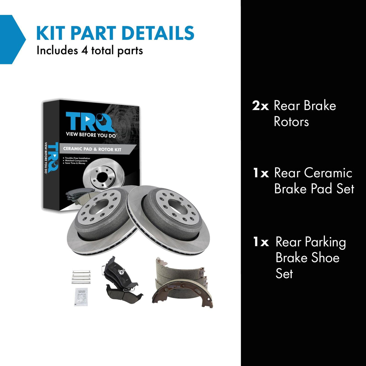 Ceramic Brake Pad & Rotor KitKit Includes(1) Rear Ceramic Brake Pad Set(1) Rear Parking Brake Shoe Set(2) Rear Brake RotorsFitmentCompatible with: 2003-08 Lincoln Town Car Sedan Rear with Parking ShoesCompatible with: 2010-11 Lincoln Town Car Sedan Rear with Parking ShoesCompatible with: 2009 Lincoln Town Car Signature Limited Rear with Parking ShoesCompatible with: 2009 Lincoln Town Car Signature L Rear with Parking ShoesProduct AttributesBrake Pad Friction Material: CeramicProduct Features Positive Molded - Less dust resulting in clean wheels G3000 Casting Alloy - Reduced noise and improved wear resistance Application Specific Design - Extended service life, no modificationsItem DetailsTRQ brake kits are designed to restore your brake system to like-new performance. TRQ brake pads are positive molded, thermal scorched, chamfered, and utilize a multi-layer shim for enhanced performance and service life. TRQ rotors have a non-directional finish that reduces the break-in period for new rotors as well as reducing vibrations throughout the rotors lifecycle. All products are fit and road-tested in our Massachusetts R&D facility to ensure we deliver on our promise of Trusted Reliable Quality.Reference NumbersAimco: 54101Autopart International: 1414-315309Bendix: PRT5379DuraGo: BR54101Ford: 3W1Z2N712AALincoln: 3W1Z2200AA, 3W1Z2N712AAMercury: 3W1Z2200AA, 3W1Z2N712AARaybestos Brakes: 680107, 680107FZN, 680107P, 680107R, EHT932H, MGD932CH, SGD932CWagner: BD126008
