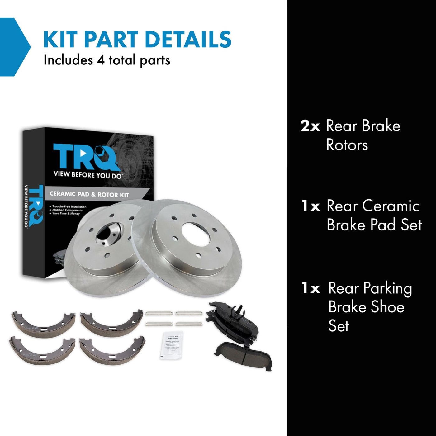 Ceramic Brake Pad & Rotor KitKit Includes(1) Rear Ceramic Brake Pad Set(1) Rear Parking Brake Shoe Set(2) Rear Brake RotorsFitmentCompatible with: 2004-15 Nissan Titan Rear with Parking ShoesCompatible with: 2005-15 Nissan Armada Rear with Parking ShoesCompatible with: 2004-10 Infiniti QX56 Rear with Parking ShoesCompatible with: 2004 Nissan Pathfinder Armada Rear with Parking ShoesProduct AttributesBrake Pad Friction Material: CeramicProduct Features Positive Molded - Less dust resulting in clean wheels G3000 Casting Alloy - Reduced noise and improved wear resistance Application Specific Design - Extended service life, no modificationsItem DetailsTRQ brake kits are designed to restore your brake system to like-new performance. TRQ brake pads are positive molded, thermal scorched, chamfered, and utilize a multi-layer shim for enhanced performance and service life. TRQ rotors have a non-directional finish that reduces the break-in period for new rotors as well as reducing vibrations throughout the rotors lifecycle. All products are fit and road-tested in our Massachusetts R&D facility to ensure we deliver on our promise of Trusted Reliable Quality.Reference NumbersAimco: 31329Bendix: PRT5475DuraGo: BR31329Hollander: 533-59044INFINITI: 440607S025, 44060ZC025Nissan: 440607S025, 44060ZC025, 44060ZC026, D40609FE0ARaybestos Brakes: 868PG, 980198, 980198FZN, 980198P, 980198PER, 980198R, EHT1041H, MGD1041CH, SGD1041CWagner Brake: Z868Wagner: BD126387