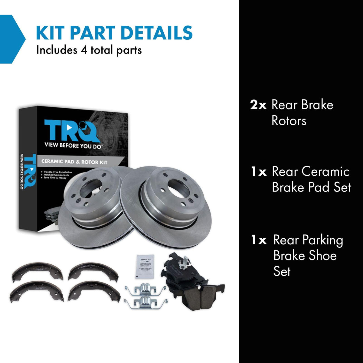 Ceramic Brake Pad & Rotor KitKit Includes(1) Rear Ceramic Brake Pad Set(1) Rear Parking Brake Shoe Set(2) Rear Brake RotorsFitmentCompatible with: 2006-07 BMW 530xi Rear with Parking ShoesCompatible with: 2009-10 BMW 528i xDrive Rear with Parking ShoesCompatible with: 2008 BMW 535xi Rear with Parking ShoesCompatible with: 2009-10 BMW 535i xDrive Rear with Parking ShoesCompatible with: 2010 BMW 528i Rear with Parking ShoesCompatible with: 2008 BMW 528xi Rear with Parking ShoesCompatible with: 2006-07 BMW 525xi Rear with Parking ShoesProduct AttributesBrake Pad Friction Material: CeramicProduct Features Positive Molded - Less dust resulting in clean wheels G3000 Casting Alloy - Reduced noise and improved wear resistance Application Specific Design - Extended service life, no modificationsItem DetailsTRQ brake kits are designed to restore your brake system to like-new performance. TRQ brake pads are positive molded, thermal scorched, chamfered, and utilize a multi-layer shim for enhanced performance and service life. TRQ rotors have a non-directional finish that reduces the break-in period for new rotors as well as reducing vibrations throughout the rotors lifecycle. All products are fit and road-tested in our Massachusetts R&D facility to ensure we deliver on our promise of Trusted Reliable Quality.Reference NumbersAimco: 34318Bendix: PRT5820BMW: 34216763043, 34216763044, 34216776937, 34216784135, 34216857108, 34216868497DuraGo: BR900736Raybestos Brakes: 890PG, 980496, 980496FZN, 980496P, 980496R, EHT1042Wagner Brake: Z890Wagner: BD126517