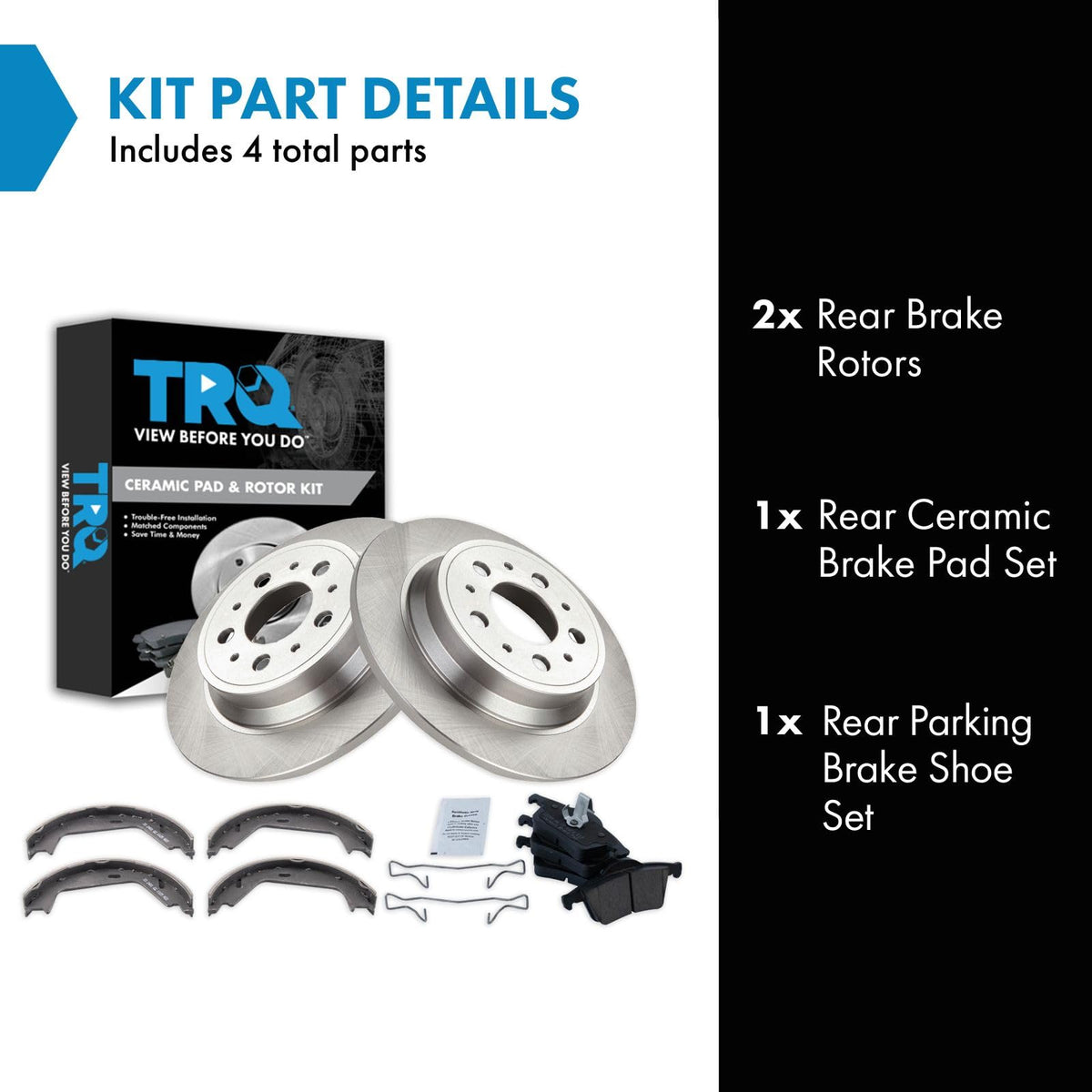 Ceramic Brake Pad & Rotor Kitkit Includes(1) Rear Ceramic Brake Pad Set(1) Rear Parking Brake Shoe Set(2) Rear Brake Rotorsfitmentcompatible With: 2006-07 Volvo S60 T5 Rear With Parking Shoescompatible With: 2006-07 Volvo S60 2.5T Rear With Parking Shoescompatible With: 2006-07 Volvo Xc70 Rear With Parking Shoescompatible With: 2004-06 Volvo S80 Rear With Parking Shoescompatible With: 2008-09 Volvo S60 Rear With Parking Shoescompatible With: 2006 Volvo V70 2.5T Rear With Parking Shoesproduct Attributesbrake Pad Friction Material: Ceramicproduct Features Positive Molded - Less Dust Resulting In Clean Wheels G3000 Casting Alloy - Reduced Noise And Improved Wear Resistance Application Specific Design - Extended Service Life, No Modificationsitem Detailstrq Brake Kits Are Designed To Restore Your Brake System To Like-New Performance. Trq Brake Pads Are Positive Molded, Thermal Scorched, Chamfered, And Utilize A Multi-Layer Shim For Enhanced Performance And Service Life. Trq Rotors Have A Non-Directional Finish That Reduces The Break-In Period For New Rotors As Well As Reducing Vibrations Throughout The Rotors Lifecycle. All Products Are Fit And Road-Tested In Our Massachusetts R&D Facility To Ensure We Deliver On Our Promise Of Trusted Reliable Quality.Reference Numbersaimco: 34206Bendix: Prt5409Durago: Br34206Hollander: 533-58541Raybestos Brakes: 968Pg, 980045, 980045Fzn, 980045P, 980045R, Eht795Volvo: 2723997, 30648382, 306483820, 86349250, 86349255Wagner Brake: Z968Wagner: Bd126218