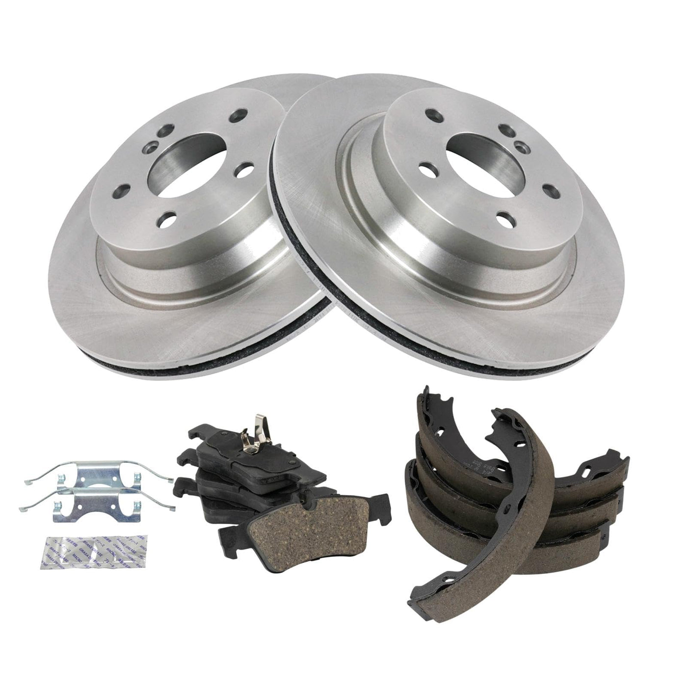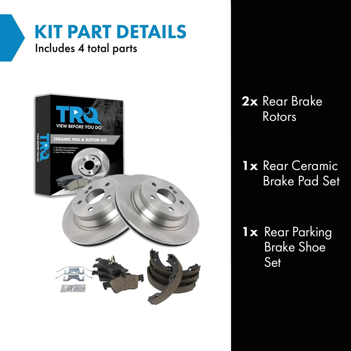 Ceramic Brake Pad & Rotor KitKit Includes(1) Rear Ceramic Brake Pad Set(1) Rear Parking Brake Shoe Set(2) Rear Brake RotorsFitmentCompatible with: 2007-09 Mercedes Benz E350 Rear with Parking ShoesCompatible with: 2004-06 Mercedes Benz E320 Rear with Vented Rotors with Parking ShoesCompatible with: 2006 Mercedes Benz E350 Rear with Vented Rotors with Parking ShoesCompatible with: 2003-06 Mercedes Benz E500 Rear with Vented Rotors with Parking ShoesCompatible with: 2006 Mercedes Benz CLS500 Rear with Parking ShoesCompatible with: 2007-09 Mercedes Benz E550 Rear with Parking ShoesProduct AttributesBrake Pad Friction Material: CeramicProduct Features Positive Molded - Less dust resulting in clean wheels G3000 Casting Alloy - Reduced noise and improved wear resistance Application Specific Design - Extended service life, no modificationsItem DetailsTRQ brake kits are designed to restore your brake system to like-new performance. TRQ brake pads are positive molded, thermal scorched, chamfered, and utilize a multi-layer shim for enhanced performance and service life. TRQ rotors have a non-directional finish that reduces the break-in period for new rotors as well as reducing vibrations throughout the rotors lifecycle. All products are fit and road-tested in our Massachusetts R&D facility to ensure we deliver on our promise of Trusted Reliable Quality.Reference NumbersAimco: 34247Bendix: PRT5543DuraGo: BR34247Hollander: 533-58697Mercedes-Benz: 34205120, 4230230, 44204420Raybestos Brakes: 874PG, 980270, 980270FZN, 980270P, 980270R, MGD986C, PGD986CWagner Brake: Z874Wagner: BD180135