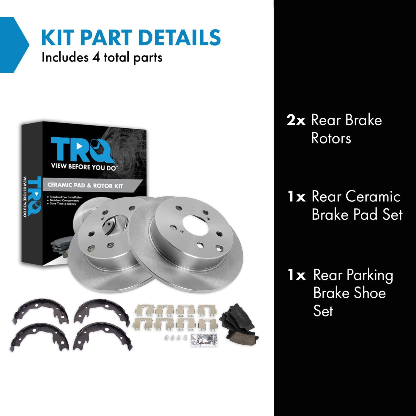Ceramic Brake Pad & Rotor KitKit Includes(1) Rear Ceramic Brake Pad Set(1) Rear Parking Brake Shoe Set(2) Rear Brake RotorsFitmentCompatible with: 2006-18 Toyota Rav4 Rear with Parking ShoesCompatible with: 2010-12 Lexus HS250h Rear with Parking ShoesProduct AttributesBrake Pad Friction Material: CeramicProduct Features Positive Molded - Less dust resulting in clean wheels G3000 Casting Alloy - Reduced noise and improved wear resistance Application Specific Design - Extended service life, no modificationsItem DetailsTRQ brake kits are designed to restore your brake system to like-new performance. TRQ brake pads are positive molded, thermal scorched, chamfered, and utilize a multi-layer shim for enhanced performance and service life. TRQ rotors have a non-directional finish that reduces the break-in period for new rotors as well as reducing vibrations throughout the rotors lifecycle. All products are fit and road-tested in our Massachusetts R&D facility to ensure we deliver on our promise of Trusted Reliable Quality.Reference NumbersAimco: 31443Bendix: PRT5922DuraGo: BR900360Hollander: 533-50122Lexus: 446606090, 446633160, 446633180, 446633200, 446642060Pontiac: 19184917Raybestos Brakes: 916PG, 980483, 980483FZN, 980483P, 980483R, EHT1212H, MGD1212CH, SGD1212CToyota: 1446633210, 446602220, 446606060, 446606090, 446606200, 446633160, 446633180, 446642060Wagner Brake: Z916Wagner: BD126405
