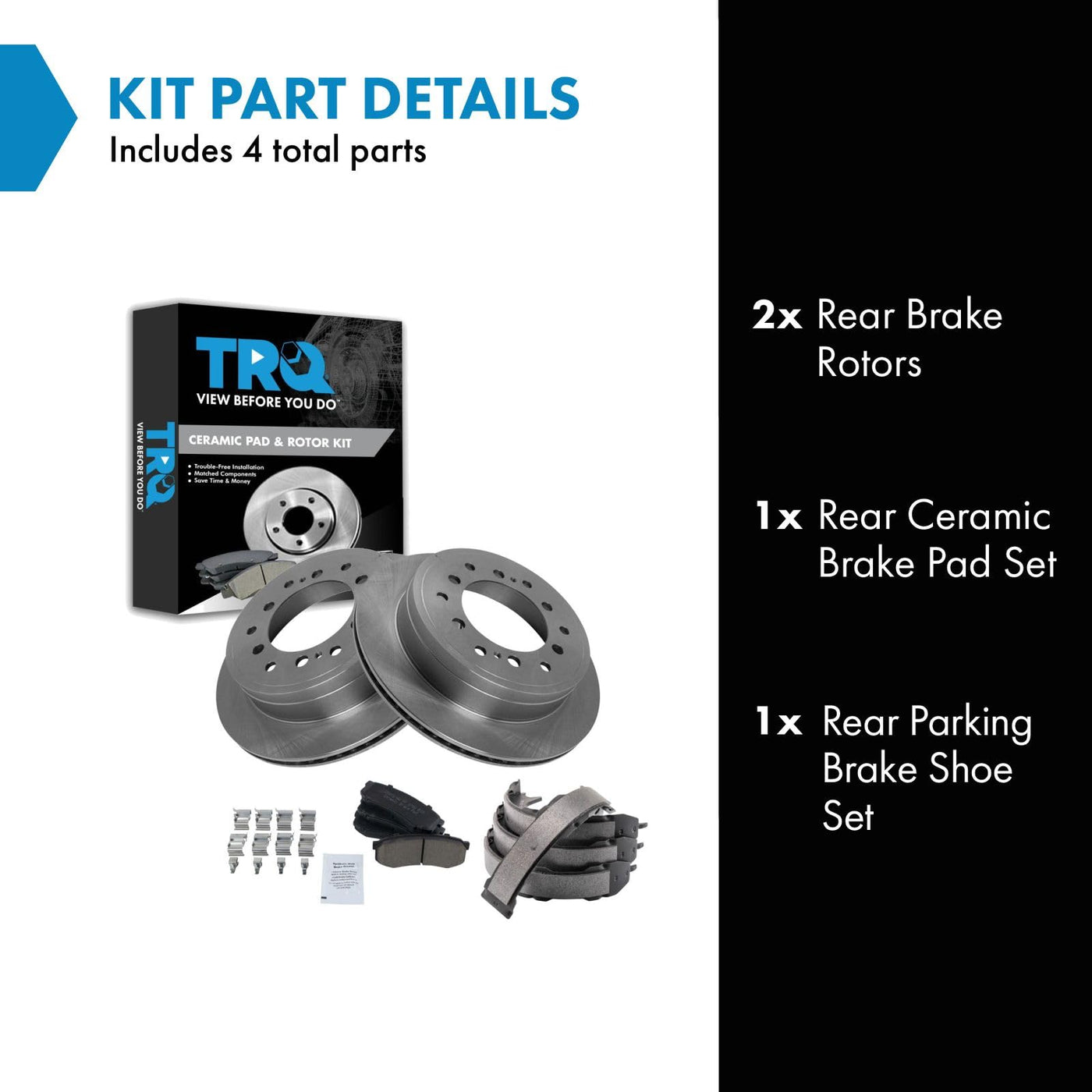 Ceramic Brake Pad & Rotor KitKit Includes(1) Rear Ceramic Brake Pad Set(1) Rear Parking Brake Shoe Set(2) Rear Brake RotorsFitmentCompatible with: 2010-22 Toyota 4Runner Rear with Parking ShoesCompatible with: 2010-22 Lexus GX460 Rear with Parking ShoesCompatible with: 2010-14 Toyota FJ Cruiser Rear with Parking ShoesProduct AttributesBrake Pad Friction Material: CeramicProduct Features Positive Molded - Less dust resulting in clean wheels G3000 Casting Alloy - Reduced noise and improved wear resistance Application Specific Design - Extended service life, no modificationsItem DetailsTRQ brake kits are designed to restore your brake system to like-new performance. TRQ brake pads are positive molded, thermal scorched, chamfered, and utilize a multi-layer shim for enhanced performance and service life. TRQ rotors have a non-directional finish that reduces the break-in period for new rotors as well as reducing vibrations throughout the rotors lifecycle. All products are fit and road-tested in our Massachusetts R&D facility to ensure we deliver on our promise of Trusted Reliable Quality.Reference NumbersAimco: 31550Bendix: PRT6067DuraGo: BR900912Lexus: 446660020, 446660060, 446660090, 446660140Raybestos Brakes: 850PG, 980780, 980780FZN, 980780P, 980780PER, 980780R, EHT606H, MGD606CHToyota: 446660020, 446660060, 446660080, 446660090, 446660140, 449260020Wagner Brake: Z850Wagner: BD180391