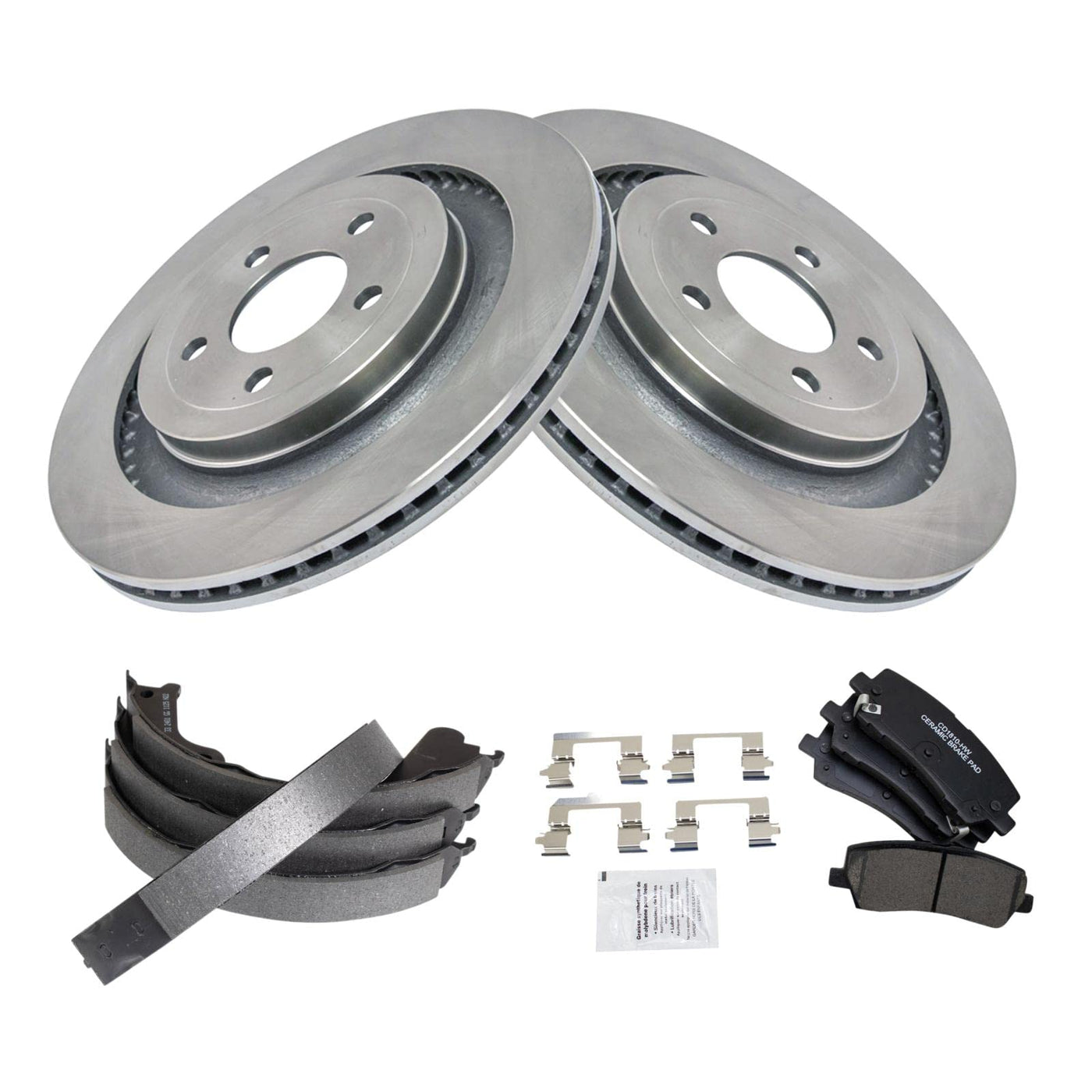 Ceramic Brake Pad & Rotor KitKit Includes(1) Rear Ceramic Brake Pad Set(1) Rear Parking Brake Shoe Set(2) Rear Brake RotorsFitmentCompatible with: 2015-16 Ford Mustang EcoBoost with Performance Package Rear with Parking ShoesCompatible with: 2015-16 Ford Mustang EcoBoost Premium with Performance Package Rear with Parking ShoesCompatible with: 2017 Ford Mustang GT Premium Manual Transmission Rear with Parking ShoesCompatible with: 2017 Ford Mustang GT Premium Manual Transmission with Performance Package Rear with Parking ShoesCompatible with: 2017 Ford Mustang GT Manual Transmission with Performance Package Rear with Parking ShoesCompatible with: 2017 Ford Mustang GT Manual Transmission Rear with Parking ShoesCompatible with: 2018 Ford Mustang EcoBoost Premium with Performance Package Rear with Parking ShoesCompatible with: 2018 Ford Mustang GT Premium Rear with Parking ShoesCompatible with: 2018 Ford Mustang GT Rear with Parking ShoesCompatible with: 2018 Ford Mustang EcoBoost with Performance Package Rear with Parking ShoesProduct AttributesBrake Pad Friction Material: CeramicProduct Features Positive Molded - Less dust resulting in clean wheels G3000 Casting Alloy - Reduced noise and improved wear resistance Application Specific Design - Extended service life, no modificationsItem DetailsTRQ brake kits are designed to restore your brake system to like-new performance. TRQ brake pads are positive molded, thermal scorched, chamfered, and utilize a multi-layer shim for enhanced performance and service life. TRQ rotors have a non-directional finish that reduces the break-in period for new rotors as well as reducing vibrations throughout the rotors lifecycle. All products are fit and road-tested in our Massachusetts R&D facility to ensure we deliver on our promise of Trusted Reliable Quality.Reference NumbersAimco: 901374DuraGo: BR901374Ford: FR3Z2C026A, GR3Z2C026A, GR3Z2C026CRaybestos Brakes: 1087PG, 681955, 681955FZN, 681955P, 681955PER, 681955R, PGD1810MWagner Brake: Z1087Wagner: BD180691