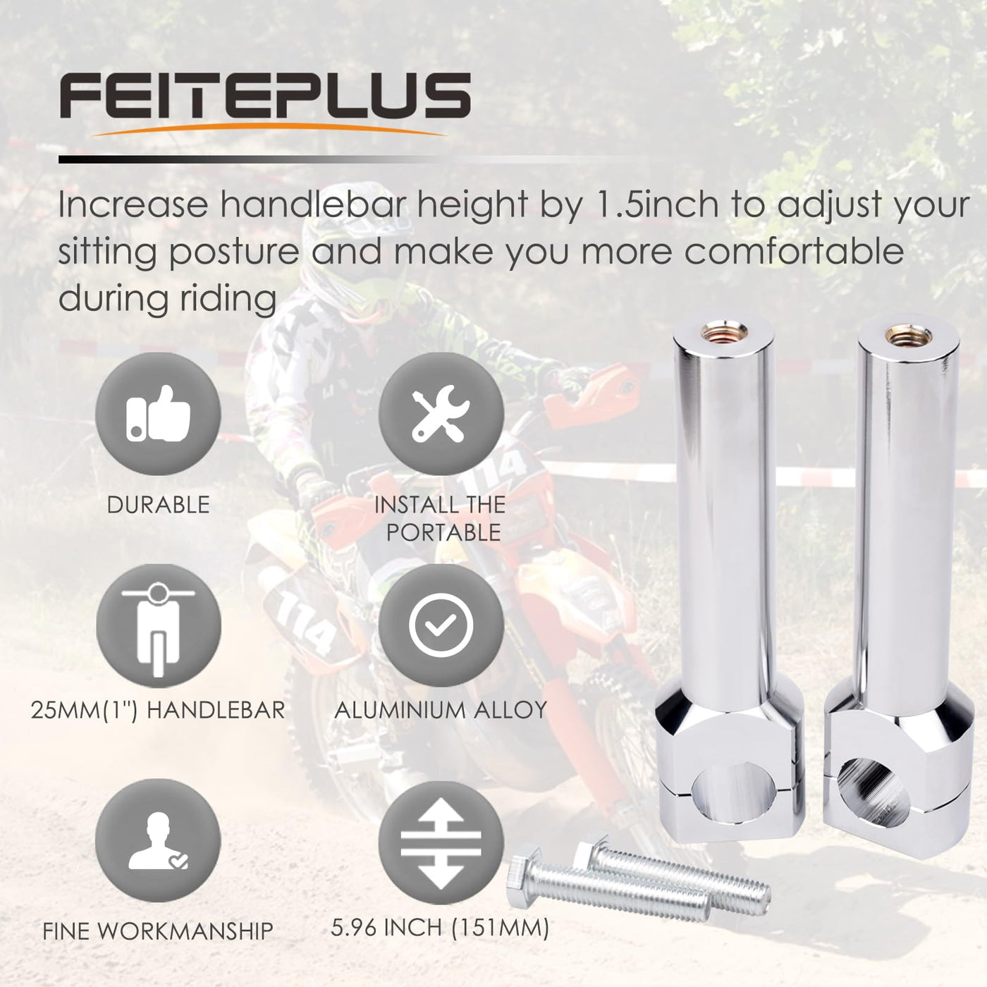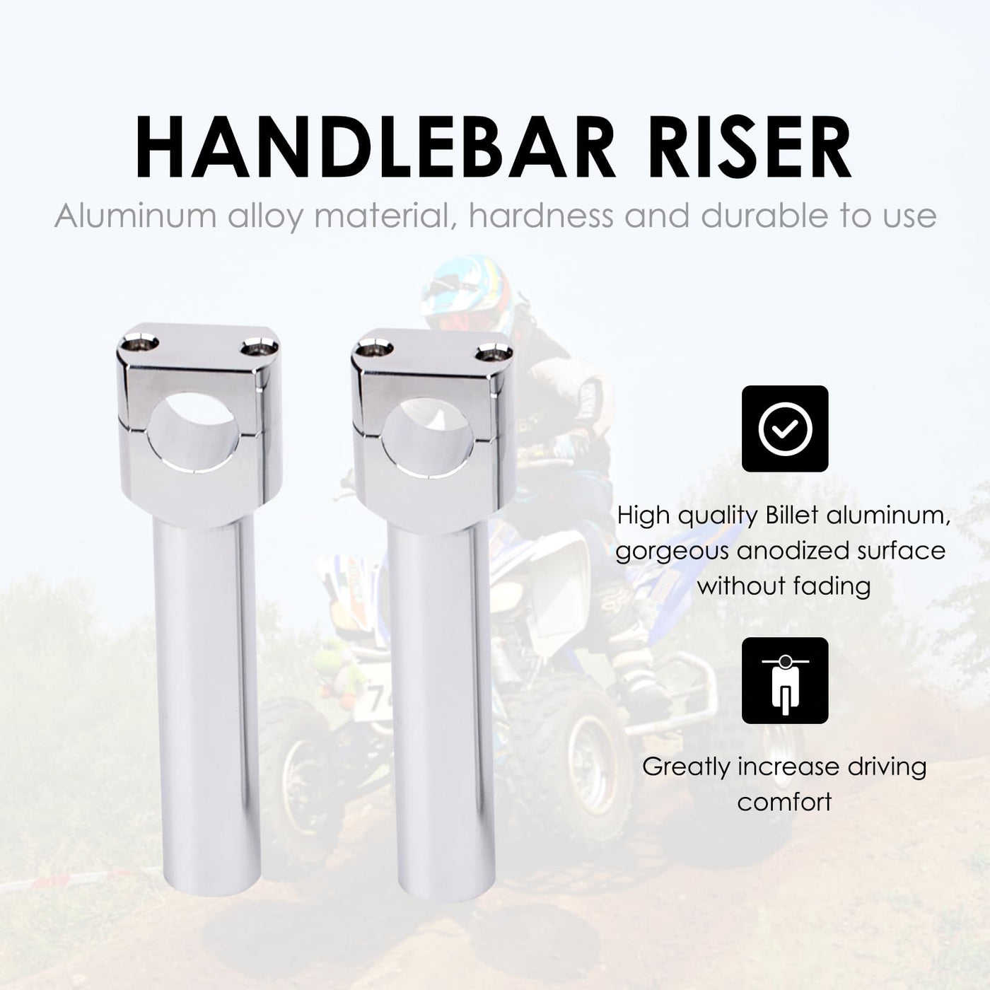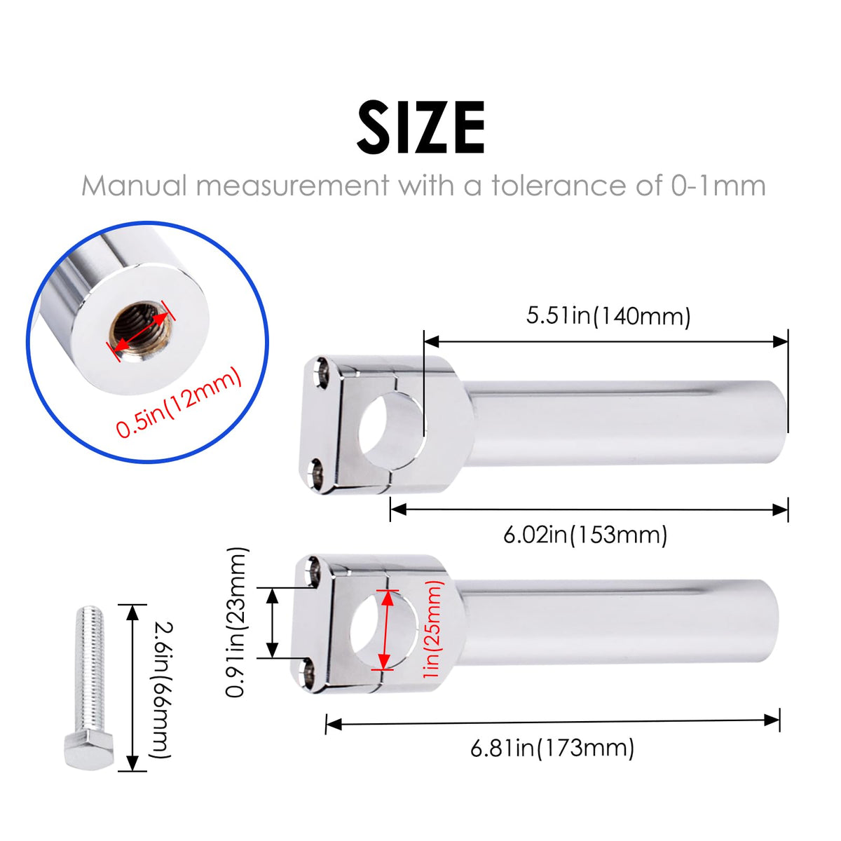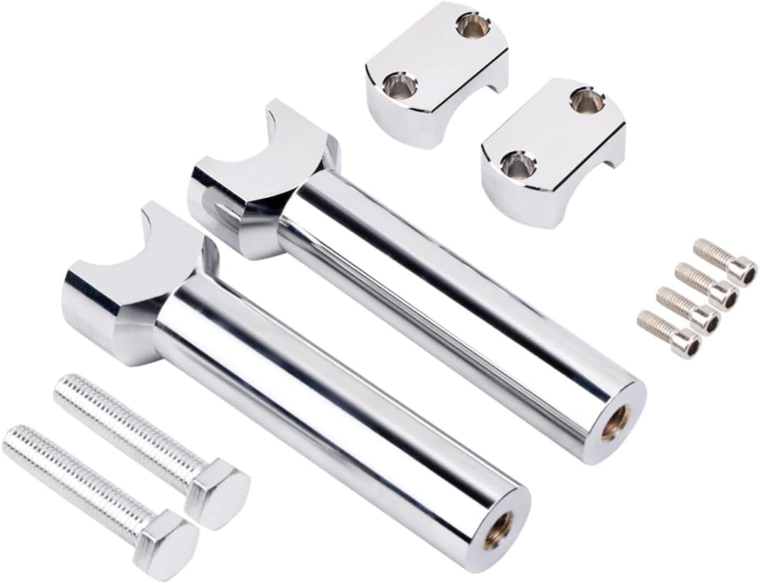 Fitment: All Motorcycles with 2.5cm/ 1 bar diameter Compatable with all Harley Davidson ,Cruisers ,Choppers ,Metrics with 2.5cm/ 1 bar diameter All Victory cruisers with 2.5cm/ 1 bar diameter Specification: Overall height 6.81inch (173mm), Hole diameter 1inch (25mm); Increase handlebar height by 5.51 inch (140mm) to adjust your sitting posture and make you more comfortable during ridingFeatures: 1. High quality aluminum alloy, tough and durable for long-lasting use 2. Provide a comfortable riding position 3. Gorgeous anodized surface and incredible lightweight Installation: This set will fit on 1 handlebars Please inspect your bikes design and determine if these will fit before purchasing Professional Installation is highly recommended Package Include: 2 * Handlebar Riser Clamps 2 * Fixing Bolts