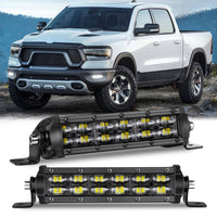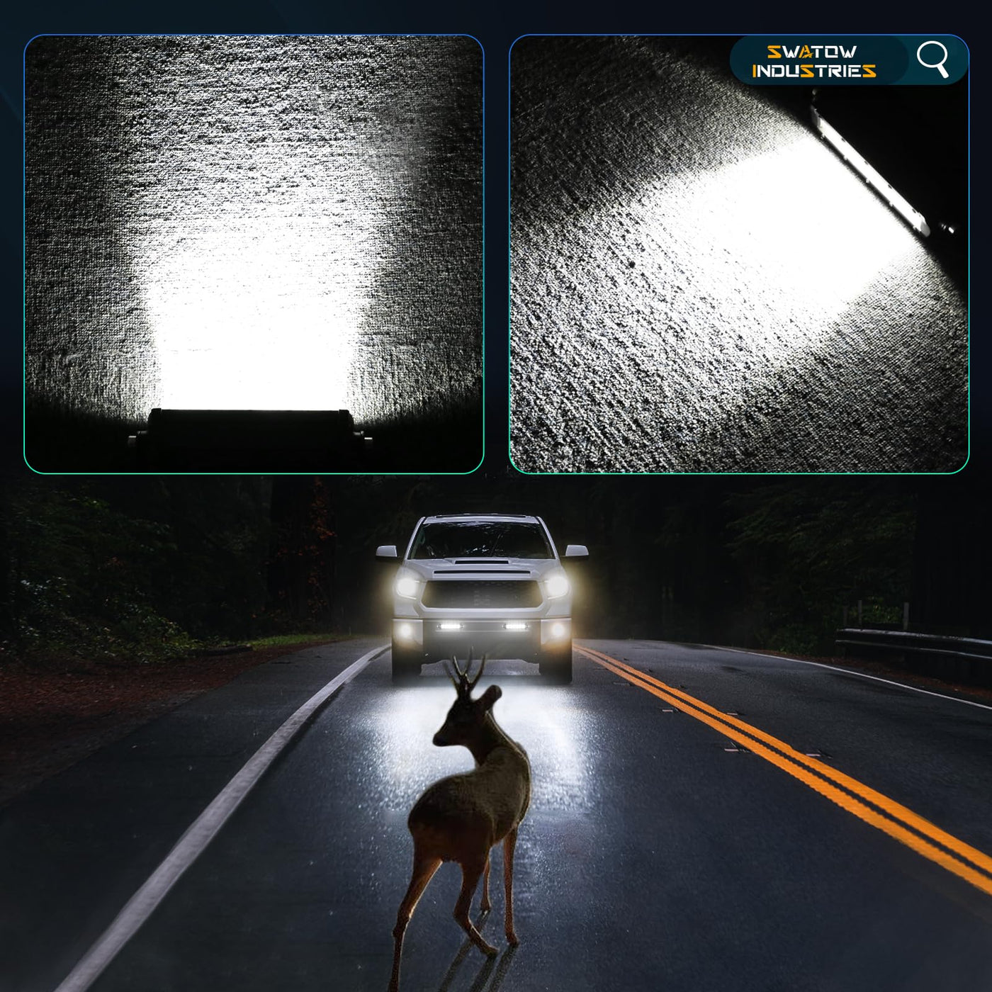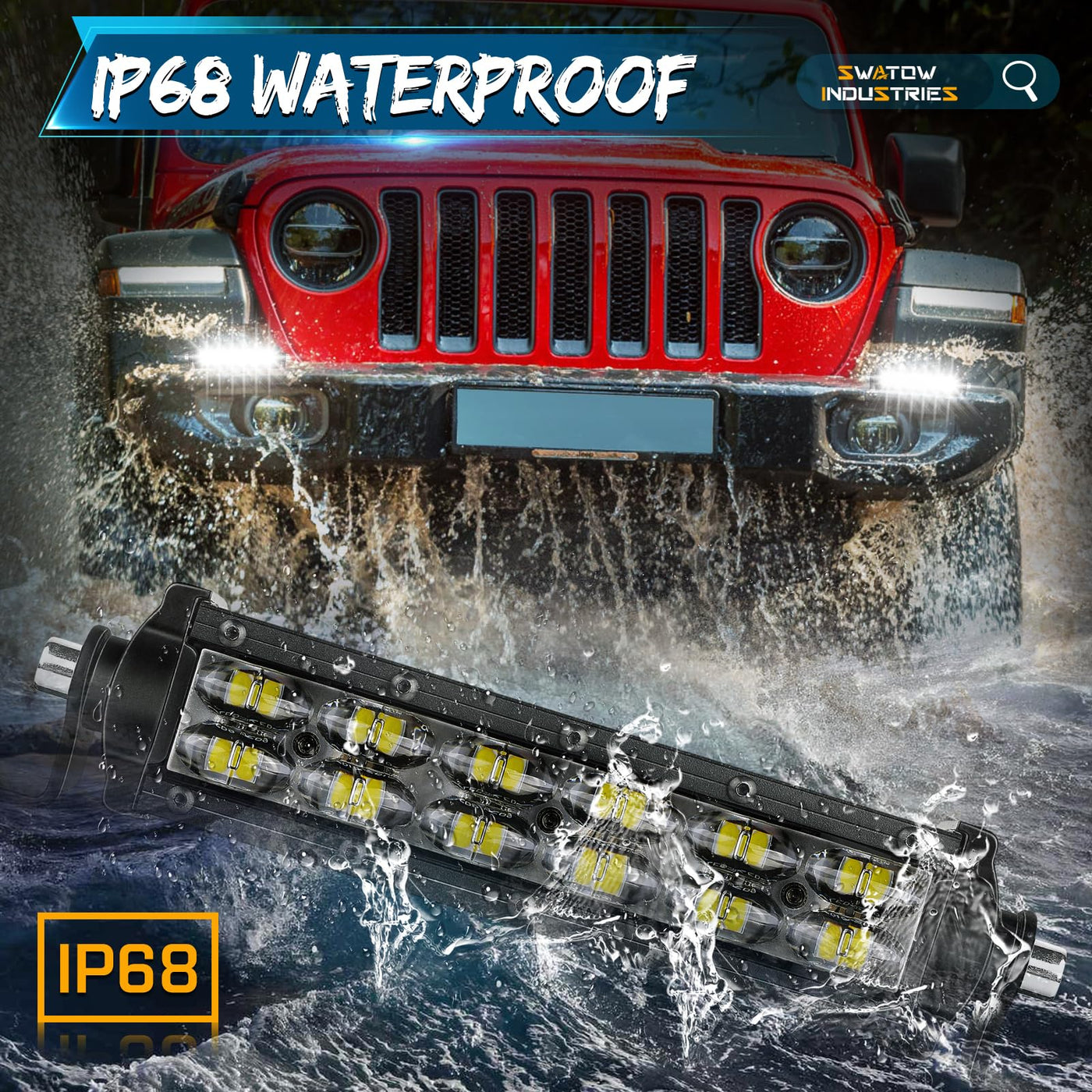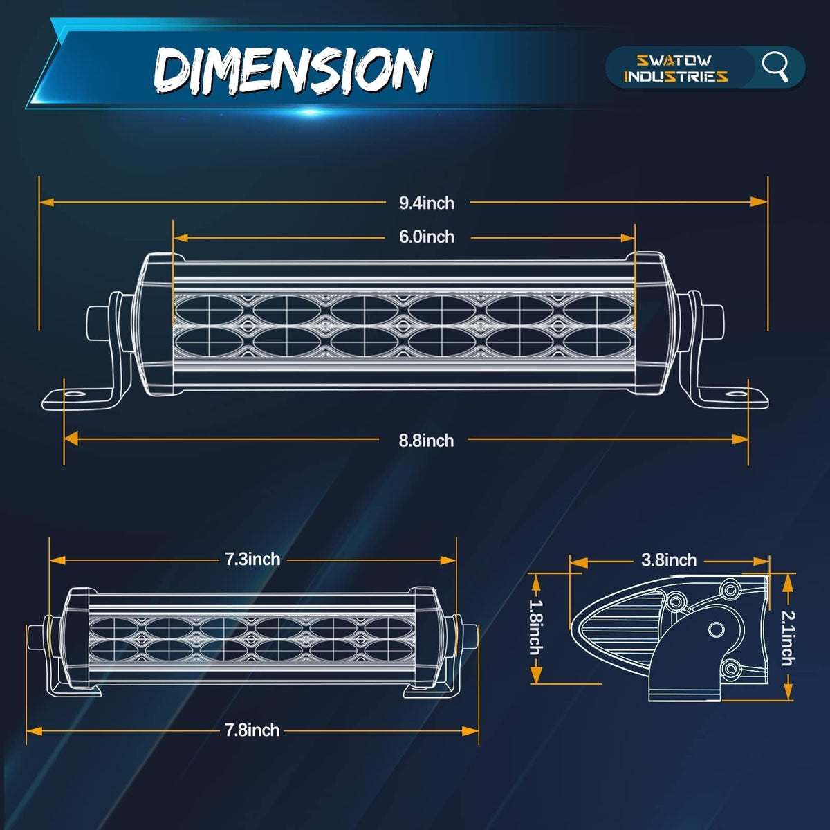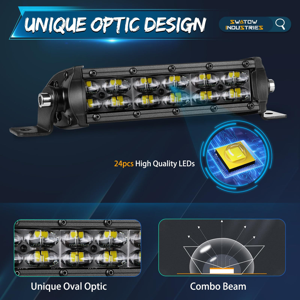 Slim LED Light Bar are one of the most important auxiliary light source for driving and your first and last line of defence to avoid any potential road hazards. Swatow Industries wanted to make sure that any customer, can enjoy our top-of-the-line LED Lights without any worry. PERFECT LIGHTING Perfect combo beam with clear cut off line that are uniform and free of hot and cold spots, to gain additional road sight at night, which offers more light output than before thanks to recent advancements in LED technology. MOUNT IT YOUR WAY The included 360 adjustable side brackets with flexible mounting options. Make mounting to any application where you need the light to look clean and be out of the way very straight forward. THERMAL MANAGEMENT Fitted up with oversize aluminum heat sink, allow heat to transfer quickly and efficiently.Keep the LEDs in optimal operating temperatures and allow our LED's to run cooler and brighter. TECHNOLOGY Unique Swatow Industries oval optic Pioneering cooling principles Corrosion resistance aluminium housing Unbreakable PC lens coated with a hardcoat lacquer, 100% optically clear Certified with IP68, CE, RoHS, ect FIT FOR Wide application, for Pickup Truck, Dodge Ram, GMC, Off Road, SUV, 4x4, ATV, Polaris, UTV.Motorcycle, Tractor, Plow, Heavy Duty, RV, Motor Homes and Boat, etc. It can also use on your garden and backyard. SPECIFICATIONS POWER: 96W/Pair LUMEN: 9,600LM/Pair LED: 24pcs LED Chips BEAM PATTERN: Combo Beam COLOR TEMP: 6000K WATERPROOF: IP68 Rate LIFESPAN: OVER 50,000 Hours HOUSING MATERIAL: Anticorrosive 6063 Aluminium Alloy OPERATING VOLTAGE: 9-30V DC COMPATIBLE VOLTAGE: DC 12V and 24V OPERATING TEMP: -40? to 85? BOX INCLUDE 2PCS 6inch LED Pods Adjustable Side Brackets Stainless Steel Nuts & Bolts