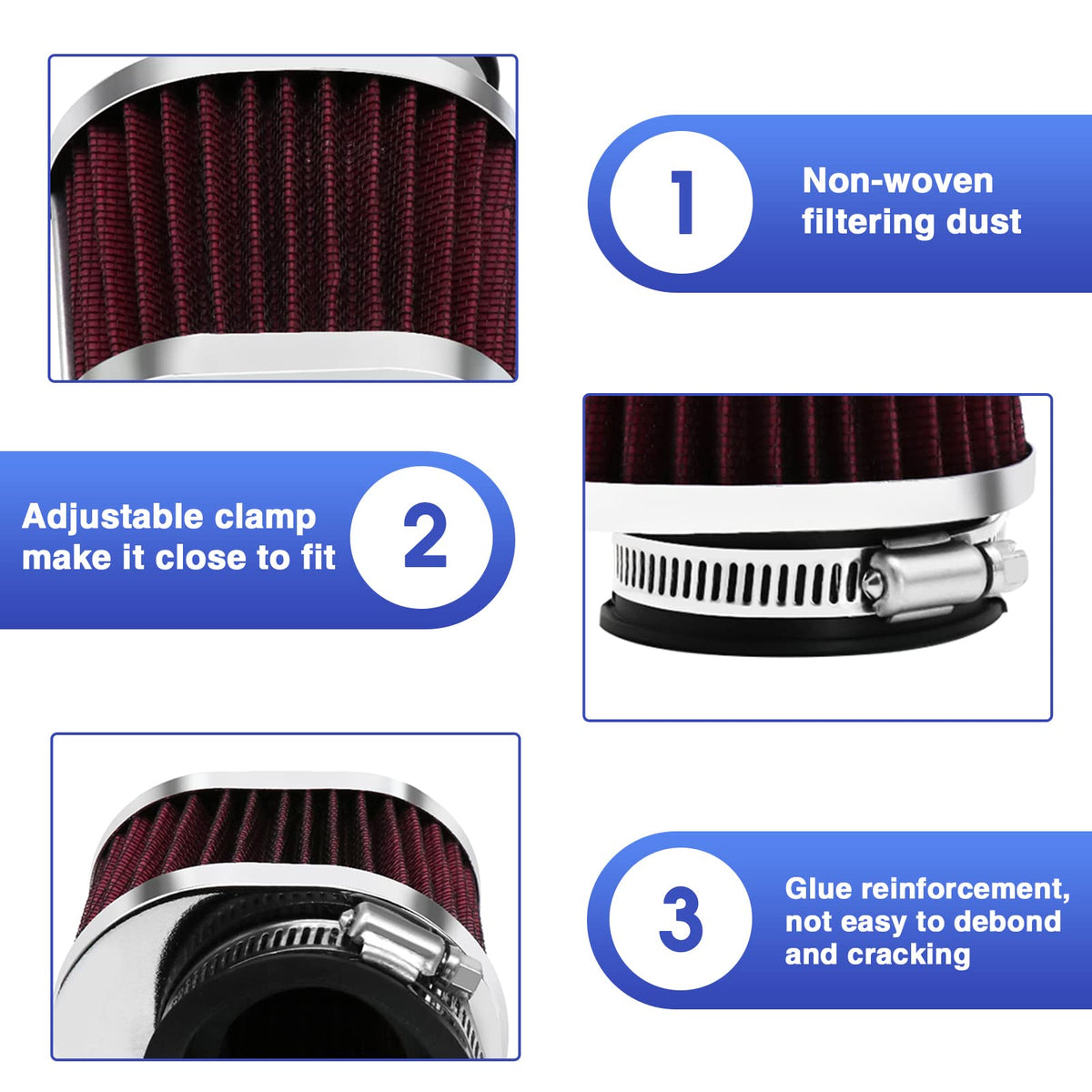 Q: What materials are used in the construction of this air filter?A: The air filter is made from high-quality materials, including a superior metal with chrome plating for corrosion resistance and a durable 360-degree non-woven mesh that increases air intake efficiency.
