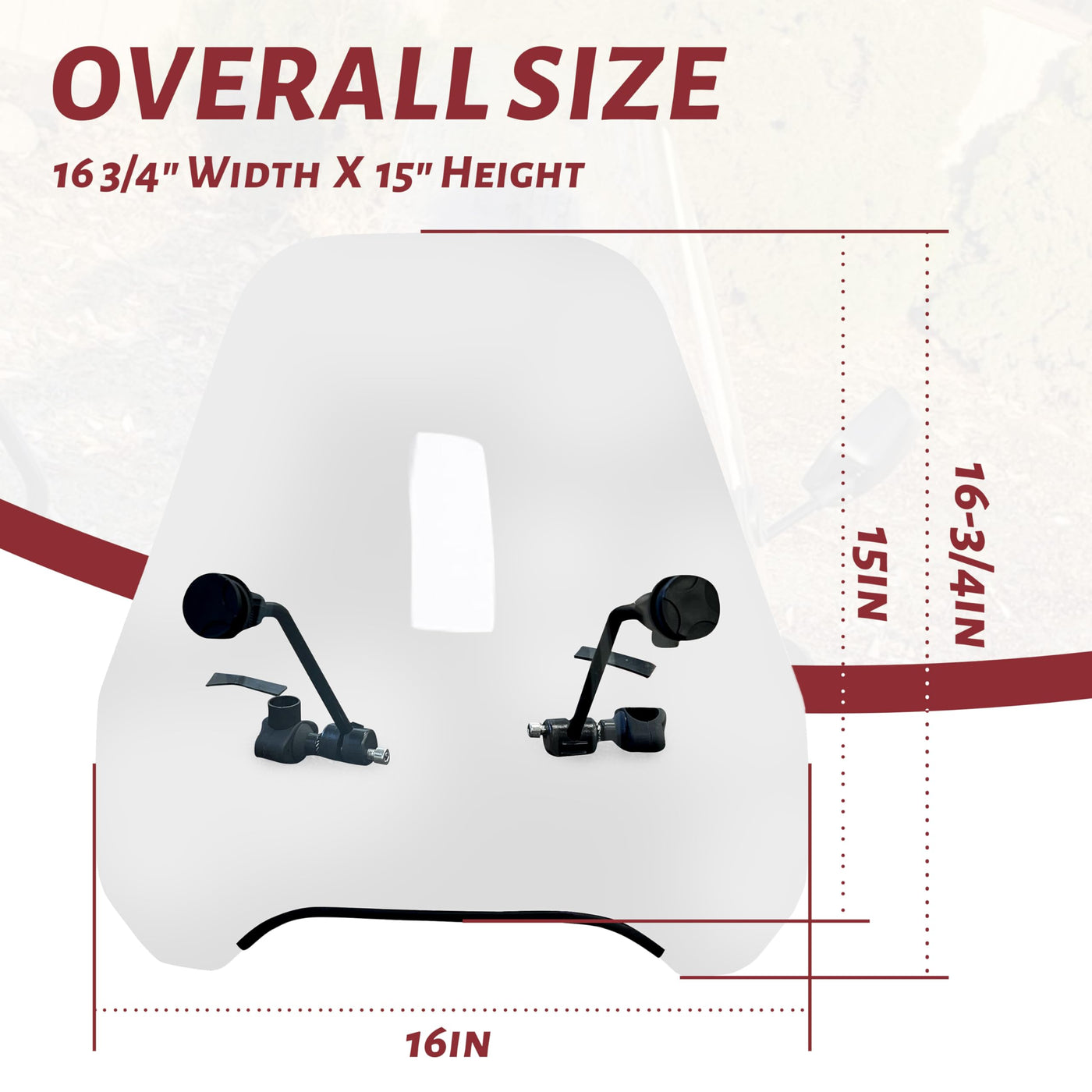 Q: What are the dimensions of the 7BLACKSMITHS Universal Motorcycle Windshield?A: The dimensions of this windshield are 16 3/4 inches in width and 15 inches in height, providing ample coverage and protection for your ride.