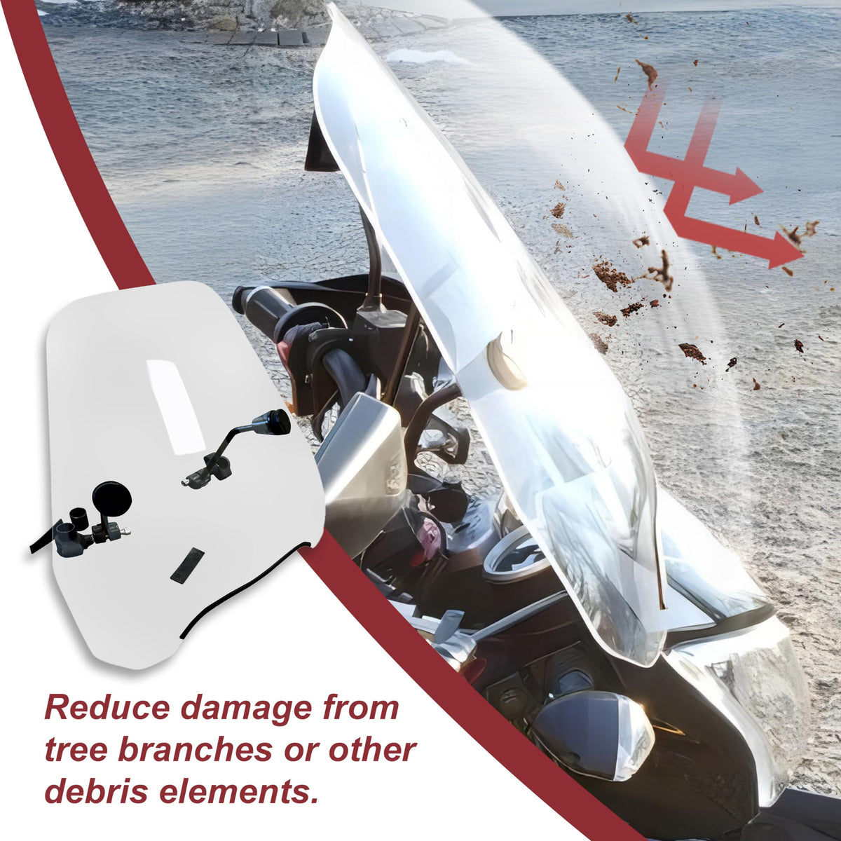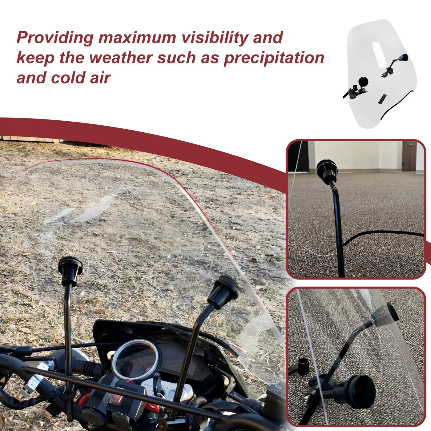 Q: How does the installation process for this windshield work?A: Installation involves three main steps: 1) Upper mount and rod installation, 2) Handlebar clamp installation, and 3) Final adjustments to ensure the windshield is at the correct angle. An assembly manual is included for guidance.