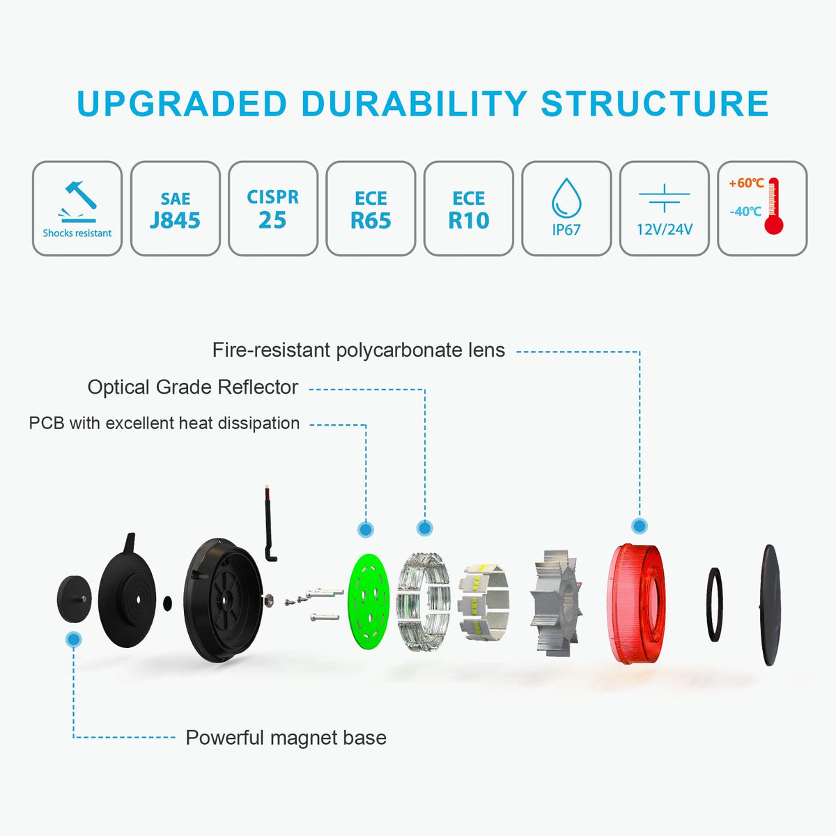 Youre Safer with Us. Every product produced by AgriEyes is built by a professional and experienced 15 person engineering team. Each design takes months or even years to study optical, structural etc., it uses the least energy consumption to achieve the highest efficiency conversion, making the design and product structure perfectly meet the market demand. We are looking forward to work with you to make our market unique and irreplaceable. Specifications: 4.2 inch Mini Strobe Light Power: 19W Color:Red Operating Voltage: 12-24V and more Seven Built in Flash Patterns: 1.Single Flash 2. Double Flash 3.Triple Flash 4.Slow Anticlockwise Rotation (480ms) 5. Slow Clockwise Rotation (480ms) 6. Quick Anticlockwise Rotation (300ms) 7. Quick Clockwise Rotation (300ms) Working Temperature: -40 ~ 65 degree Celsius. Dimension: Long 4.2'' x Width 4.2'' x Height 2.1''. Net weight:0.92lb Protection Rating: IP67 Material: ABS Base, PC Lens. Working Life: Over 50,000 hours. Charge and discharge protection. Certified by SAE J845, ECE R65 TA1, ECE R10, CE & RoHs. Packing Including: 1PC 4.2 inch Magnetic Mini Strobe Light magnetic mounting 1 x Car charging cables If you have any questions, you can contact us and we will reply you within 24 hours.