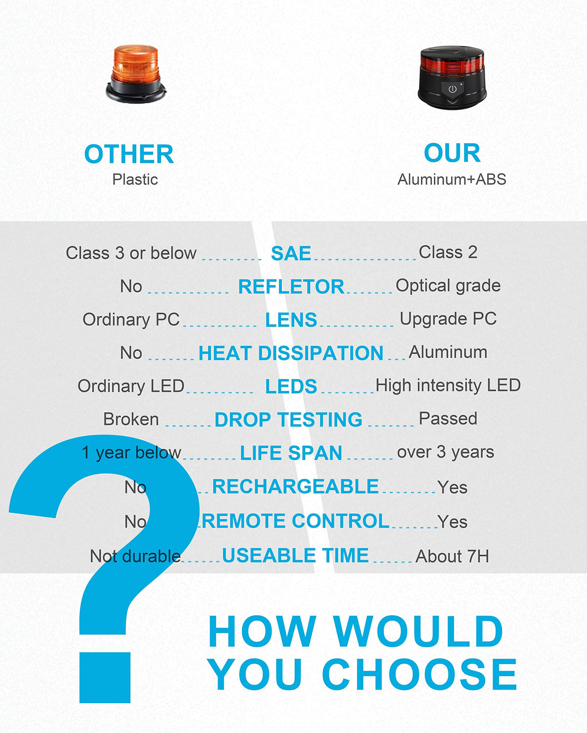 Youre Safer with Us. Every product produced by AgriEyes is built by a professional and experienced 15 person engineering team. Each design takes months or even years to study optical, structural etc., it uses the least energy consumption to achieve the highest efficiency conversion, making the design and product structure perfectly meet the market demand. We are looking forward to work with you to make our market unique and irreplaceable. Specifications: Rechargeable and Remote Control Mini Led Beacon Light Color: Red Power: 19W Operating Voltage: 12-24V and more Led Quantity: 30 Seven Built in Flash Patterns: 1.Single Flash 2. Double Flash 3.Triple Flash 4.Slow Anticlockwise Rotation (480ms) 5. Slow Clockwise Rotation (480ms) 6. Quick Anticlockwise Rotation (300ms) 7. Quick Clockwise Rotation (300ms) Working Temperature: -40 ~ 65 degree Celsius. Dimension: Long 5.11'' x Width 5.11'' x Height 2.96''. Net weight:1.28lb Protection Rating: IP67 Material: ABS Base, PC Lens. Working Life: Over 50,000 hours. Charging port: DC5.5/2.1 Charging time: About 4H Discharging time: About 6.5H Charge and discharge protection. Certified by SAE J845, ECE R65 TA1, ECE R10, CE & RoHs.Packing Including: 1PC 3.9 inch Magnetic Mini Strobe Light 1 x Remote control 1 x Car charging cablesIf you have any questions, you can contact us and we will reply you within 24 hours.