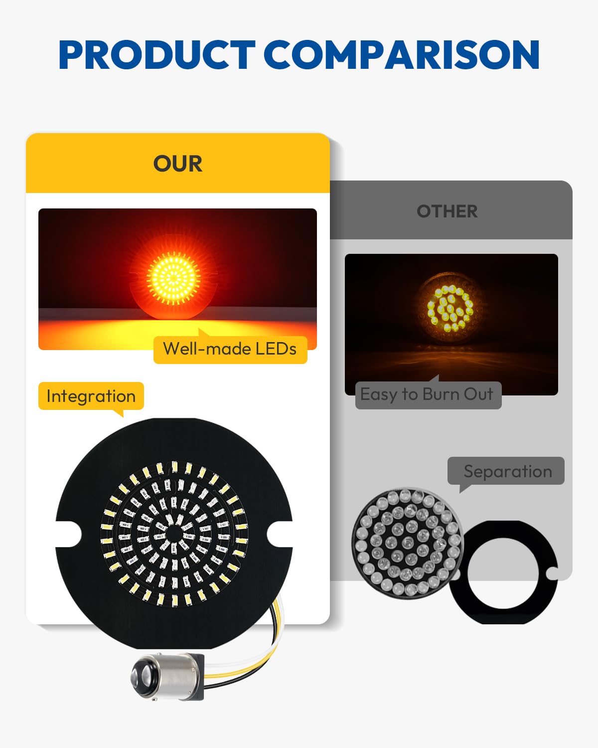 Q: How bright are these LED turn signals compared to halogen bulbs?A: These LED turn signals feature 81 PCS SMD LED lights, providing 200% higher brightness than traditional halogen bulbs. This enhanced brightness ensures better visibility during both day and night riding.