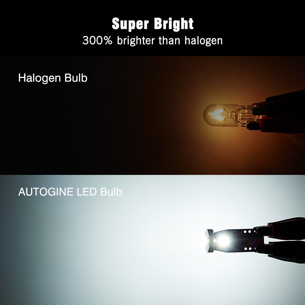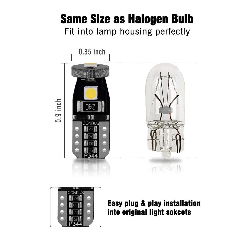 Set of 10 bulbs! 200 lumens of per bulb, these error free 194 LED bulbs will give your car a refreshed new look after a 10 minutes easy plug & play installation! Specifications: Lighting Output: 200 LM/PC Working Voltage: 12V DC Wattage: 1.5W Length: 0.9 Inches Diameter: 0.35 Inches Polarity sensitive: No Lifespan: 30,000+ Working Hours Cross Reference: 194 168 175 2825 W5W T10 124 158 158LL 160 161 161B 161LL 168A 168LL 168NA 168NALL 168ST 192 193 194A 194B 194G 194LL 194NA 194NAK 194NALL 194R 194ST 195 2821 2821LL 2825L 2825LL 2825ST 2827 2827LL 2886X 3652 3652LL 558 579 579LL 658 912LL 916 916LL 916NA 916NALL 917 917LL 920 920LL 921 922 W10W W5WB etc. Applications: License Plate Lights, Dome Lights, Map Lights, Side Door Courtesy Lights, Trunk Lights, Cargo Lights. Features: Designed with 3 pieces of 3030 LEDs, twice the amount of light output compared to halogen bulb but requires only 1/3 of the power consumption These T10 LED bulbs are CAN-Bus error free and non-polarity design, just plug and play, your car will not pop up error message after installation. 360-degree lighting angle, no visual blind, no flickering, bring you a bright and comfortable lighting experience. Note: Please double check owners manual or your original halogen bulbs to confirm the size before placing an order.