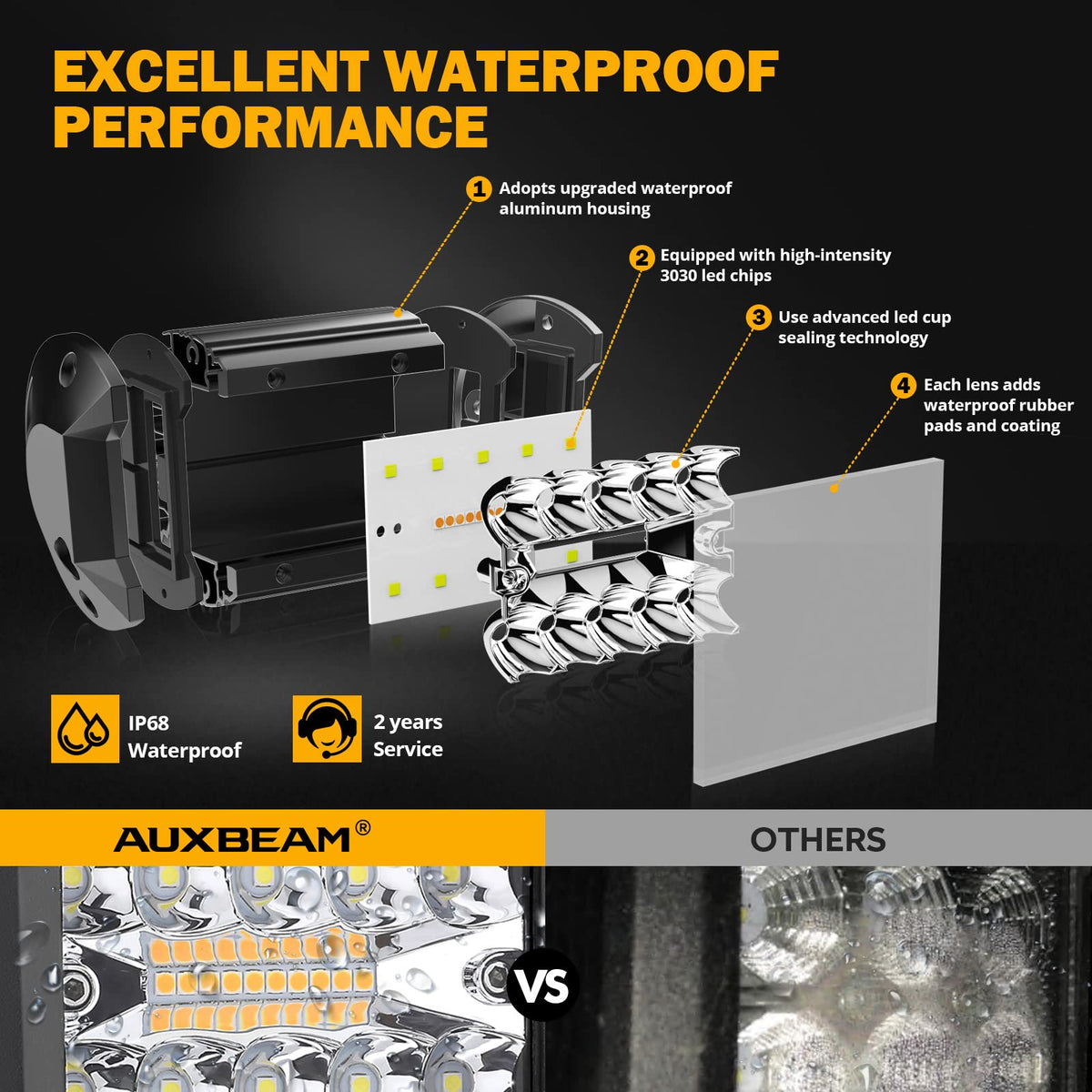Auxbeam 4 Inch Amber White Led Bar Lights For Trucks Adds Memory And Restore Function, And Comes With Auxbeam Dedicated Six-Mode Light Bar Wiring Harness-2 Lead. Auxbeam Amber Off Road Lighting Fog Lights Solves The Problem That The Lighting Mode Cannot Be Changed Normally. Dual Color Illumination Design, Our 4 Inch Amber Strobe Lights Are Very Suitable To Be Used As Off Road Lights, Ditch Lights, Fog Lights, Driving Lights, Backup Lights, Warning Lights, Work Lights.Technical Specification:Product: 4 '' Led Light Bar For Trucksled Power: 120Wlumens Output: 12000Lmoperating Voltage: 9-30V Dcwaterproof Rate: Ip 68Shell Color: Blackcolor Temperature: 6000K Amber & Whitematerial: Diecast Aluminum Housingservice Life: 50000 Hours Abovemode: Six Modes Strobe Lightinglight Type: Spot Flood Beam Combointroductionsuper Cool Engineering Beam Pattern Design, Nice Performance Even In Rainy/Snowy/Foggy Days.Nice Fitment, Easily Replaces Old Dull Filament Bulbs.Fast And Effectively Cool Down The Heat.It Meets The Ip68 International Standard. High-Performance Features Such As Waterproof, Dustproof And Shockproof. It Can Effectively Waterproof Up To 30 Minutes In 3 Feet Of Water.Cylinder Oxidation Hardened, Durable And Safe, Noise Reduction Treatment, Double-Cycle Built-In Air Pressure Treatment, The Gas Is Faster.Application:1. Off-Road Vehicles-Atvs, Suv, Trucks, Fork Lift, Trains, Boat, Car. 2. Specialized Vehicles-Fire Engine, Police Cars, Rescue Vehicle, Communication Vehicle, Military Command Vehicle Etc.3. Engineering Vehicles-Excavator, Dozer, Road Roller, Bulldozer, Crane And Mining Truck Etc.Package Included:2 X 4 Inch Led Fog Lights For Trucks1 X Auxbeam Led Light Bar Wiring Harness-2 Lead2 X Led Bar Mounting Brackets.