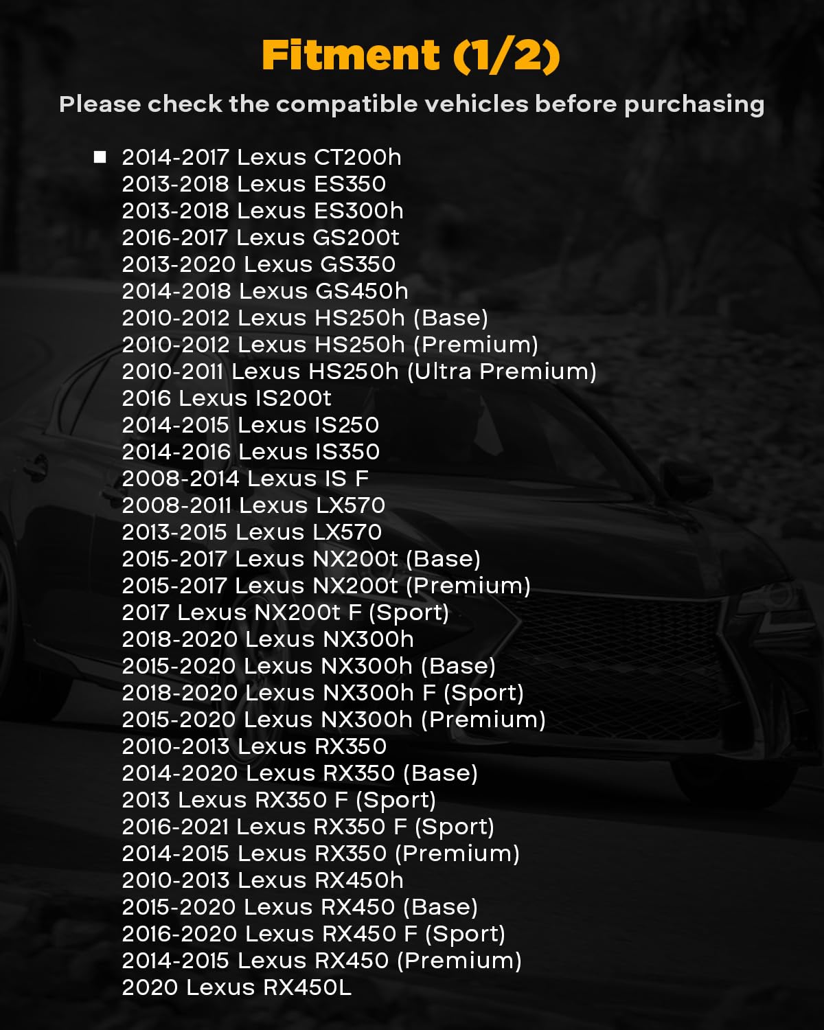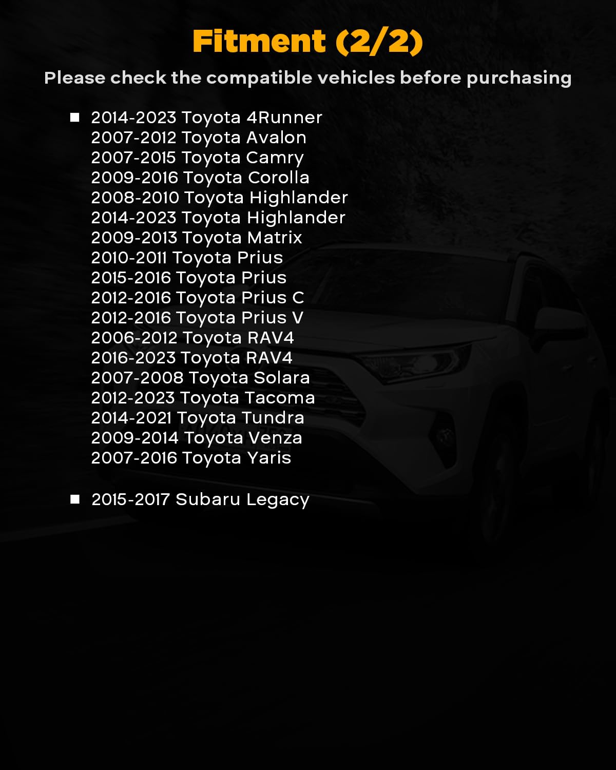 Tech Specs Compatible with Auxbeam Color Play Series 3" SAE Fog Lights Material: ABS Package Included 2 x Fog Light Bracket 2 x Adapter (H11 male to DT plug female) 1 x Screw Kit Fitment 2014-2017 Lexus CT200h 2013-2018 Lexus ES350 2013-2018 Lexus ES300h 2016-2017 Lexus GS200t 2013-2020 Lexus GS350 2014-2018 Lexus GS450h 2010-2012 Lexus HS250h (Base) 2010-2012 Lexus HS250h (Premium) 2010-2011 Lexus HS250h (Ultra Premium) 2016 Lexus IS200t 2014-2015 Lexus IS250 2014-2016 Lexus IS350 2008-2014 Lexus IS F 2008-2011 Lexus LX570 2013-2015 Lexus LX570 2015-2017 Lexus NX200t (Base) 2015-2017 Lexus NX200t (Premium) 2017 Lexus NX200t F (Sport) 2018-2020 Lexus NX300h 2015-2020 Lexus NX300h (Base) 2018-2020 Lexus NX300h F (Sport) 2015-2020 Lexus NX300h (Premium) 2010-2013 Lexus RX350 2014-2020 Lexus RX350 (Base) 2013 Lexus RX350 F (Sport) 2016-2021 Lexus RX350 F (Sport) 2014-2015 Lexus RX350 (Premium) 2010-2013 Lexus RX450h 2015-2020 Lexus RX450 (Base) 2016-2020 Lexus RX450 F (Sport) 2014-2015 Lexus RX450 (Premium) 2020 Lexus RX450L 2015-2017 Subaru Legacy 2014-2023 Toyota 4Runner 2007-2012 Toyota Avalon 2007-2015 Toyota Camry 2009-2016 Toyota Corolla 2008-2010 Toyota Highlander 2014-2023 Toyota Highlander 2009-2013 Toyota Matrix 2010-2011 Toyota Prius 2015-2016 Toyota Prius 2012-2016 Toyota Prius C 2012-2016 Toyota Prius V 2006-2012 Toyota RAV4 2016-2023 Toyota RAV4 2007-2008 Toyota Solara 2012-2023 Toyota Tacoma 2014-2021 Toyota Tundra 2009-2014 Toyota Venza 2007-2016 Toyota Yaris