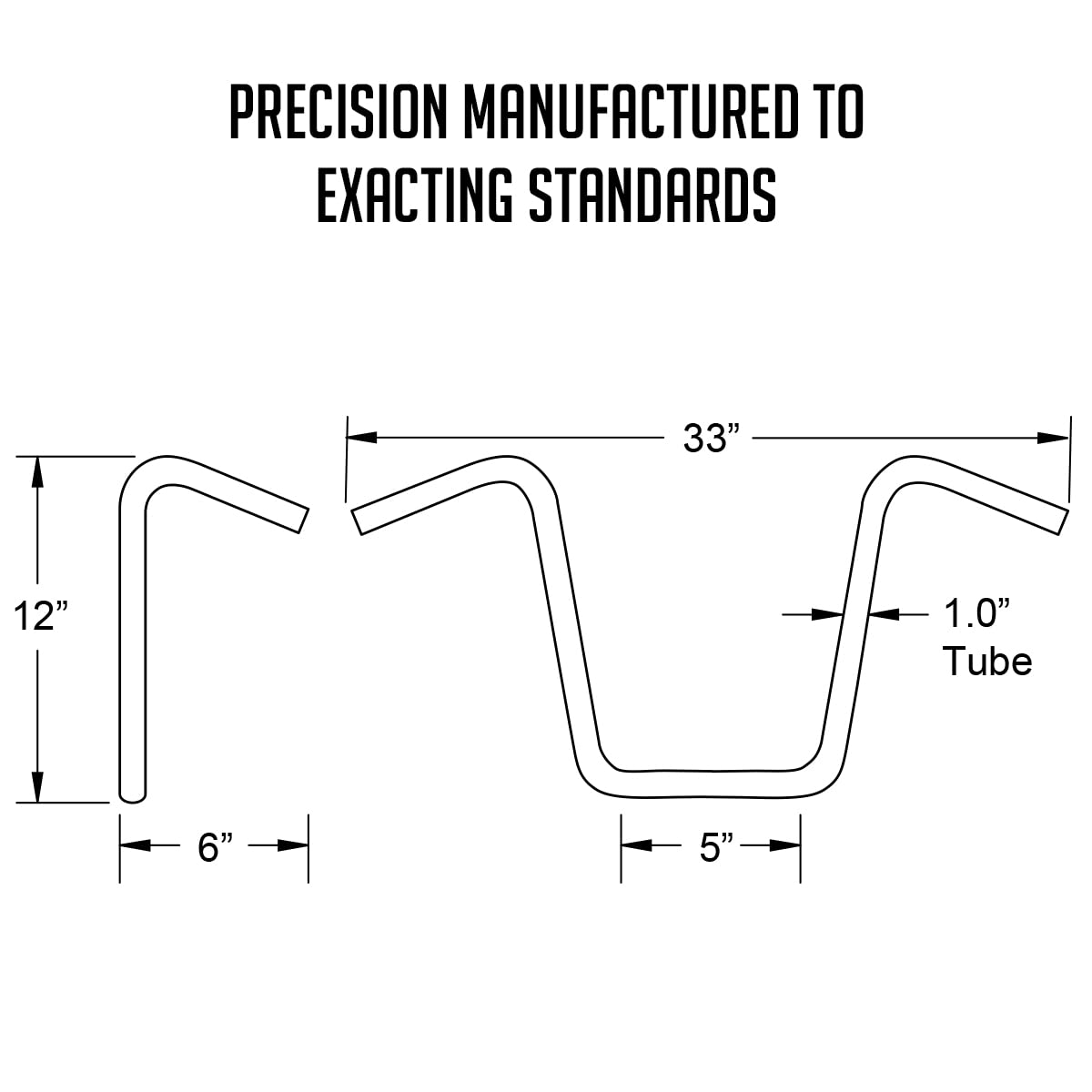 Burly Ape Handlebars Deliver A Responsive Handling Position Without Sacrificing Comfort Or Looks, With A Variety Of Models To Suit Your Desired Riding Style. Available In 12 , 14 , 16'', And 18'' Heights In A Chrome Or Gloss Black Finish. Basic Dimensions Of This Model: Height: 12'' Width: 33'' Pull Back: 6'' Center Width: 5'' Tube Diameter: 1''