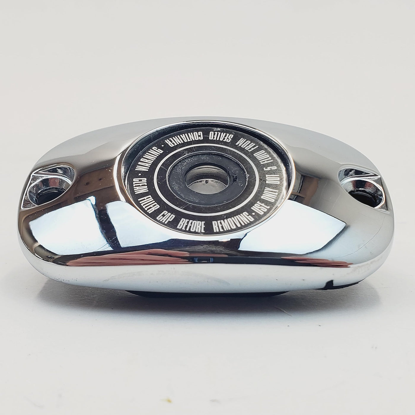 New Chrome Cover for Rear Brake Master Cylinder. This complete kit includes a chrome cover with label, rubber gasket, sight window and mounting hardware. Heavy Duty Cast part with beautiful chrome finish. Fits 1999-2004 Harley Electra Glide, Road Glide, Road King Touring Models & 1999-2005 Harley Softail Models Replaces HD# 45057-99